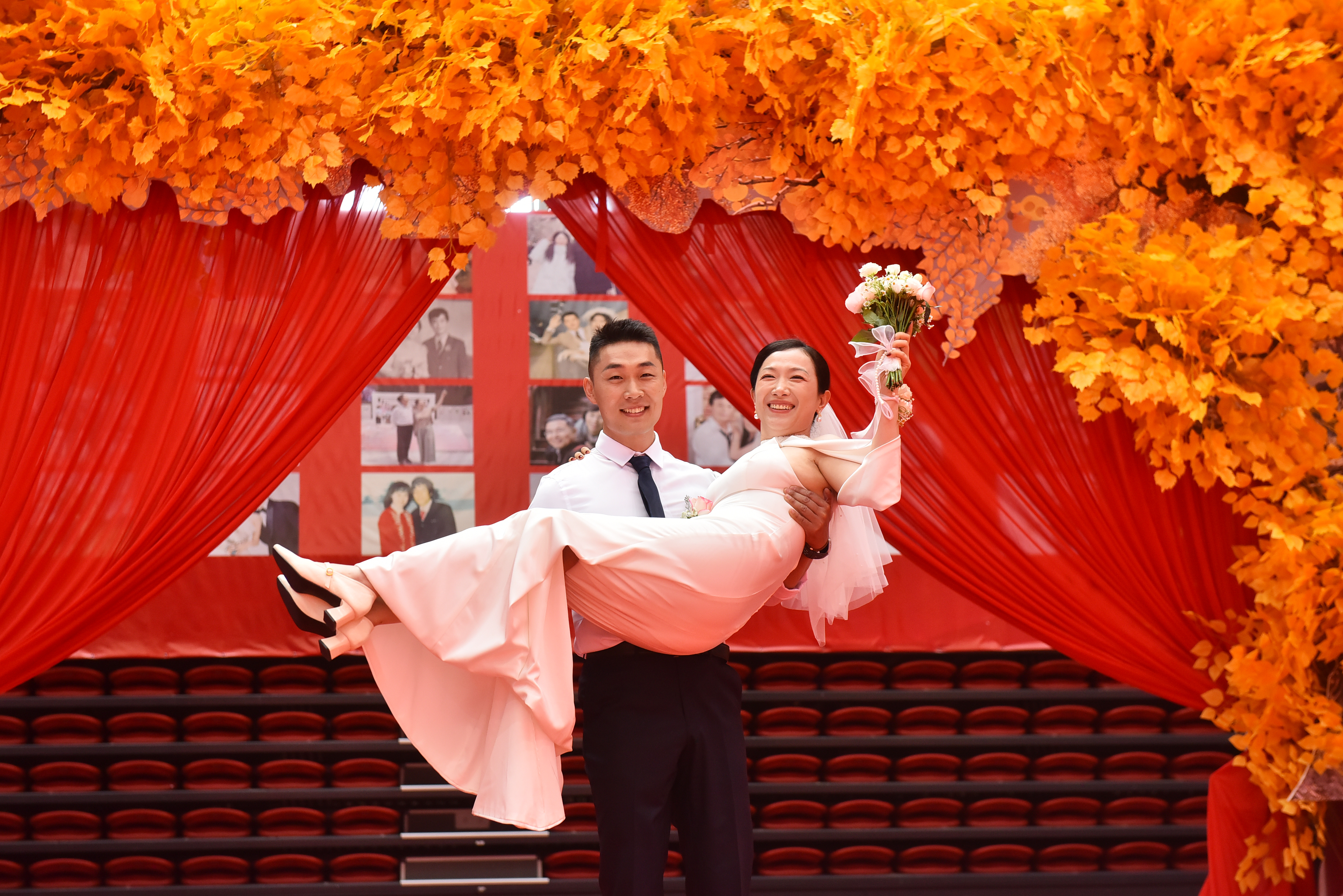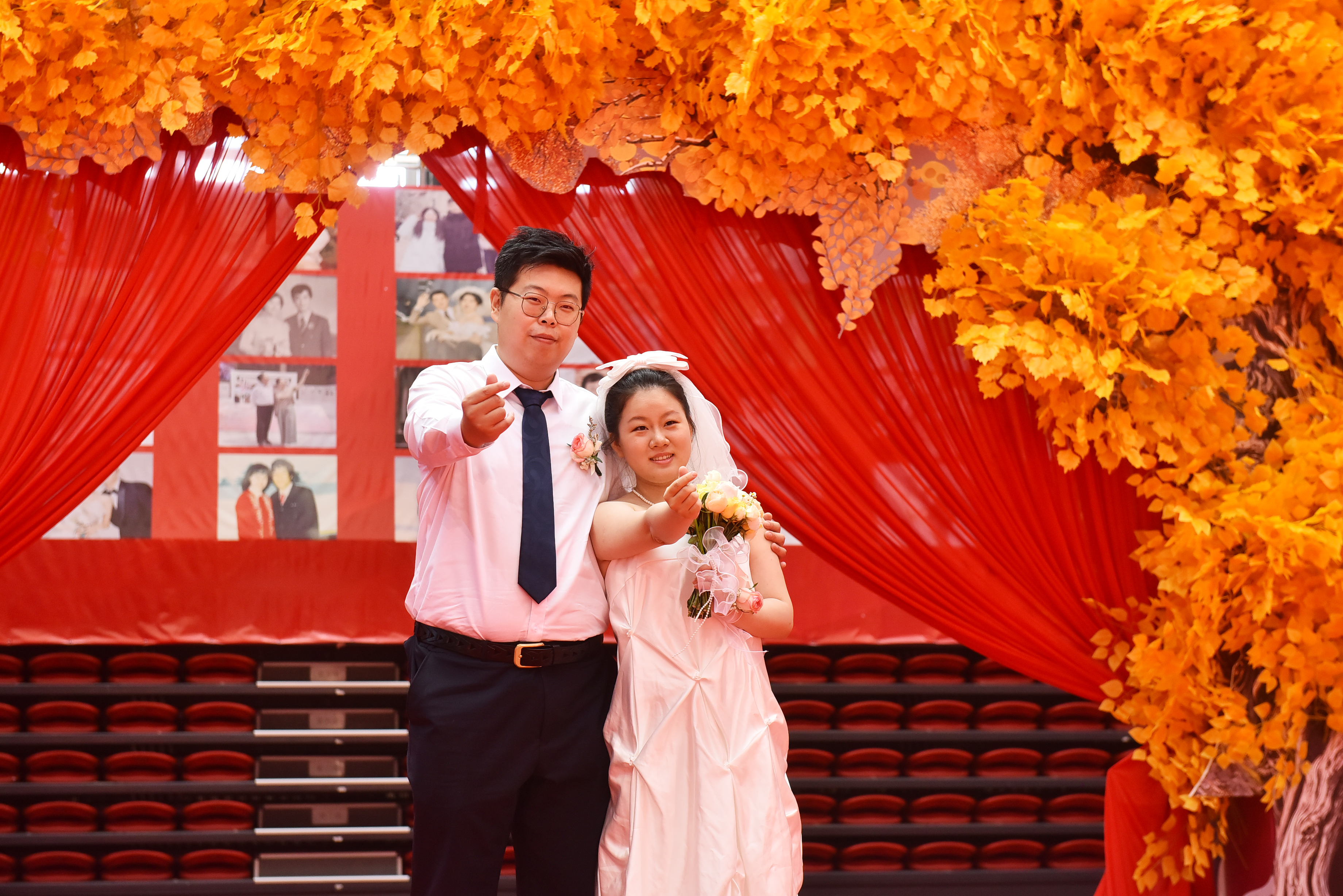 上午11点58分,体育馆鲜花簇拥,《青春舞曲》轻盈美妙,处处洋溢着幸福气息。55对新人在掌声和祝福中执手走上红毯,穿过拱门,款款步入典礼主会场。