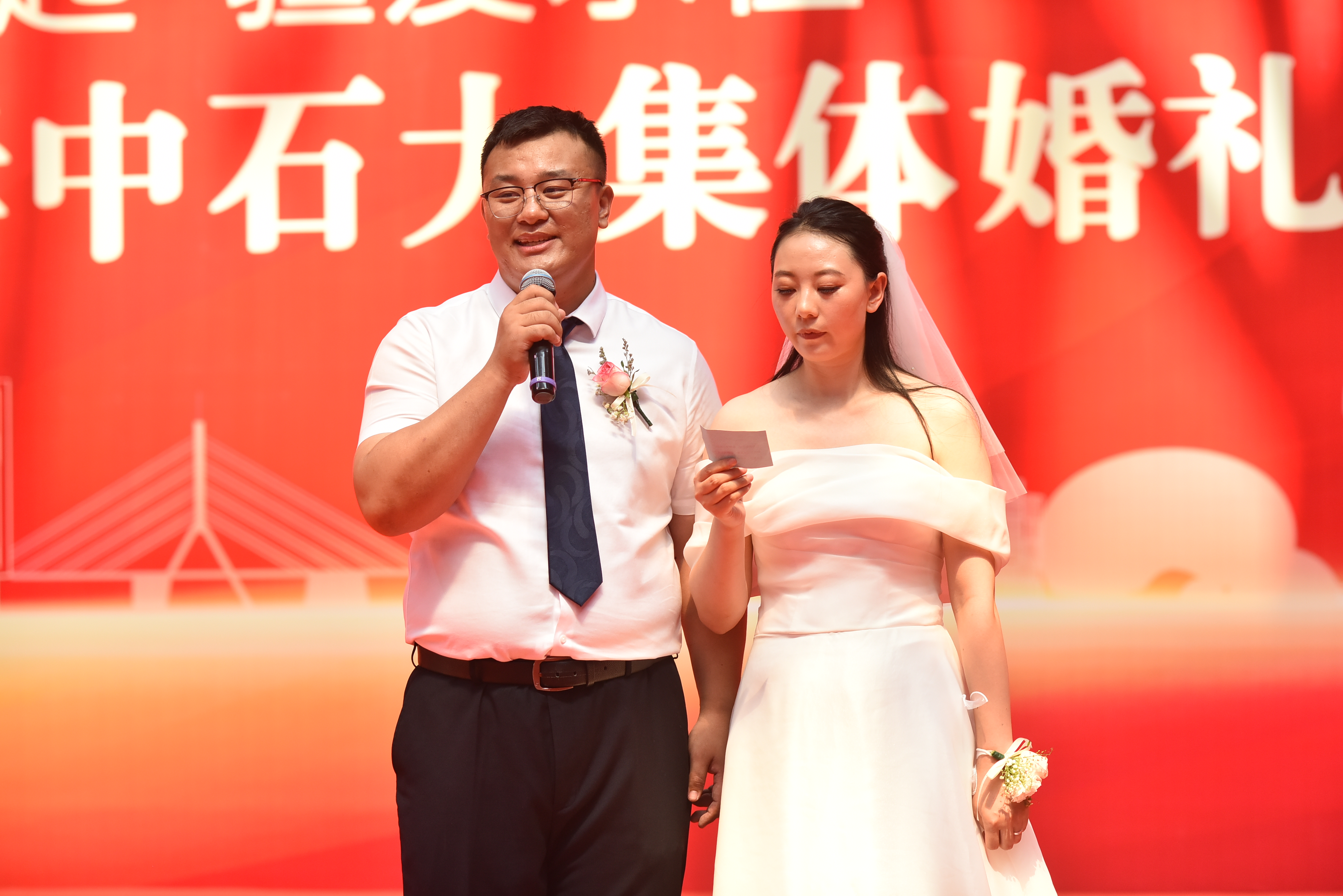 校区党委书记、校长李军为55对新人证婚,代表校区欢迎新人佳偶和亲友嘉宾们的到来。他表示,今天参加典礼的新人们是习近平总书记重要回信精神的践行者,他们用“安下心、扎下根”的行动诠释着中石大人的责任与担当,用“不畏艰难险阻,勇担时代使命”的决心与信念回应着总书记殷殷嘱托。他祝愿所有新人永结同心、百年好合,把个人幸福融入祖国山河,共筑“小而暖”的港湾,共绘“大而美”的蓝图,让中石大精神薪火相传。