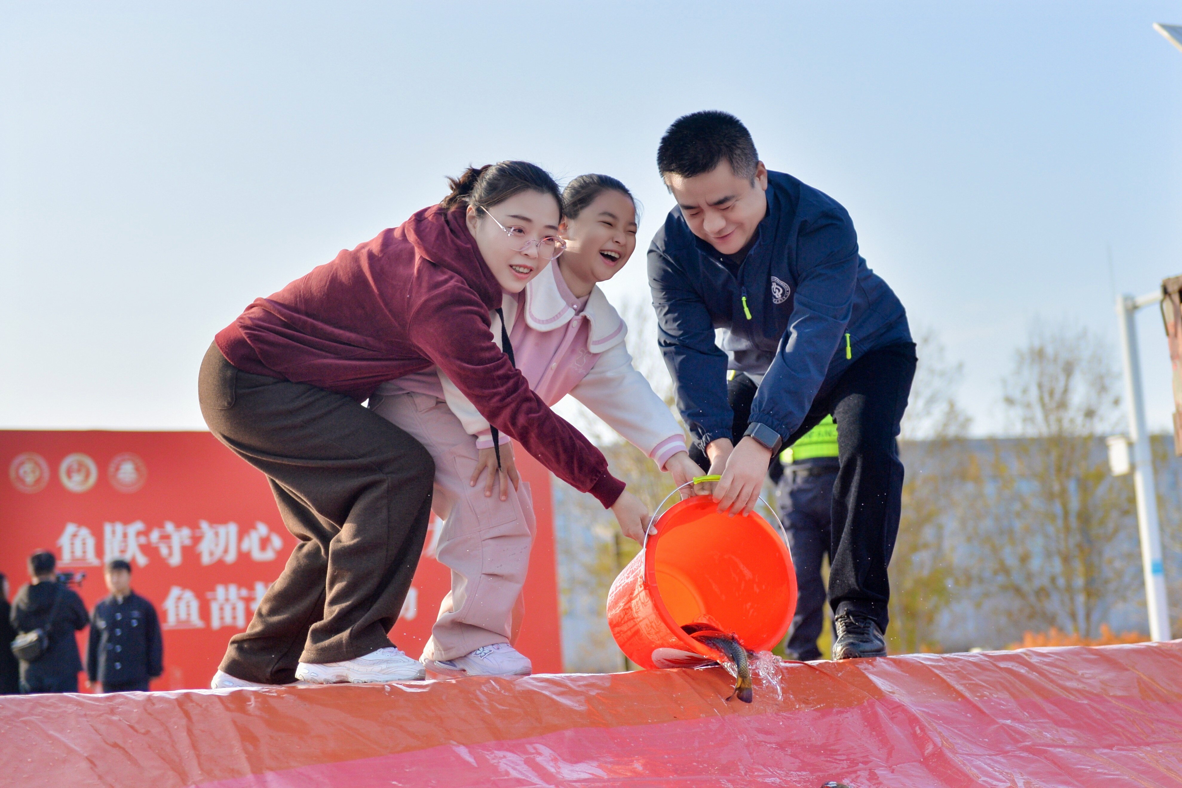 随后,参加活动的师生及校友代表一同走向红山湖畔放流区域,将5000余尾鱼苗投进水中。一尾尾鱼儿跃入水面,荡开圈圈涟漪,不仅为这片精神地标注入了新的生机,更以“鱼跃人欢”的盛景,象征着中石大精神的蓬勃生机与薪火相传。