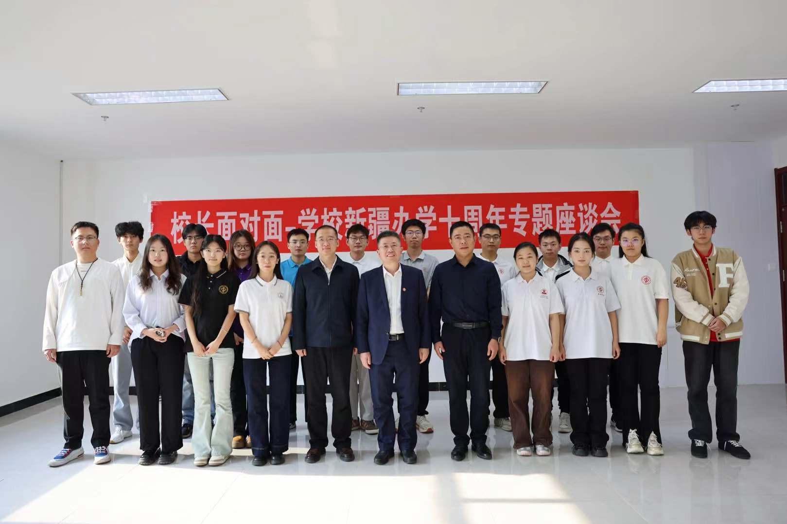 10月27日上午,“校长面对面——学校新疆办学十周年专题座谈会”在学生活动中心308室举行。学校校长金衍、相关职能部门负责人、16名学生代表齐聚一堂,共同回顾学校新疆办学十年的奋进历程,畅谈青春理想与时代使命。