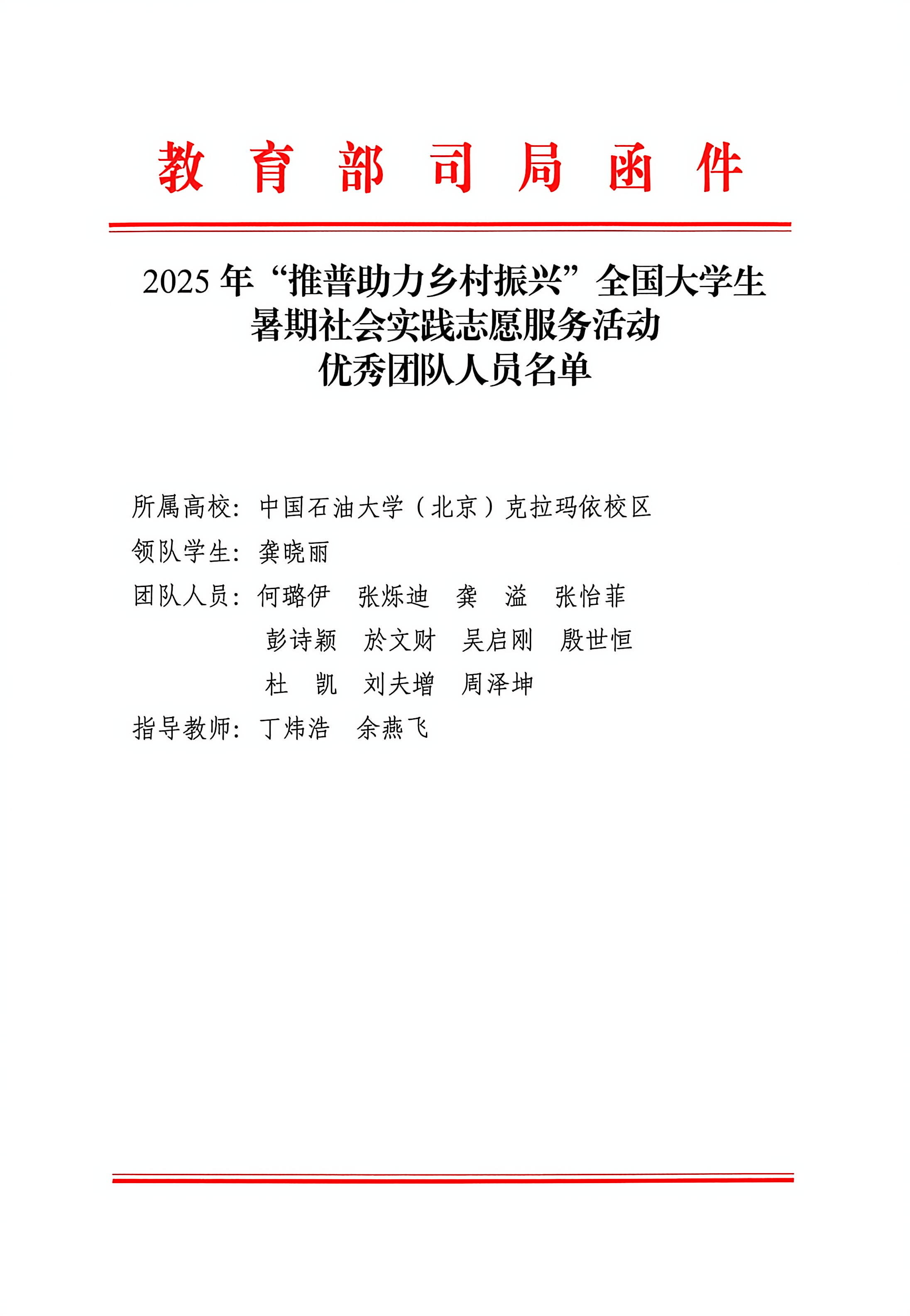 近日,由教育部语言文字应用管理司、共青团中央青年发展部联合开展的2025年“推普助力乡村振兴”全国大学生暑期社会实践志愿服务活动优秀团队评优结果公布,工商管理学院/马克思主义学院“疆来有我,基层共育”社会实践团从全国2000多支团队中脱颖而出,荣获“优秀团队”称号,并收到两部委来信表扬。