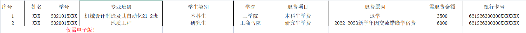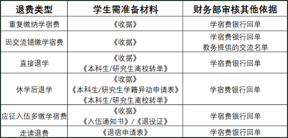 其中,《退宿申请表》、《本科生/研究生学籍异动申请表》需要相关部门盖章后作为退费审核依据,《本科生/研究生离校转单》需校园管理部签字盖章后才可作为退费审核依据。若因学籍异动、交流原因而对学宿费缴纳金额有异议,需与教(研)务部联系,教务再将变动信息反馈至财务部。