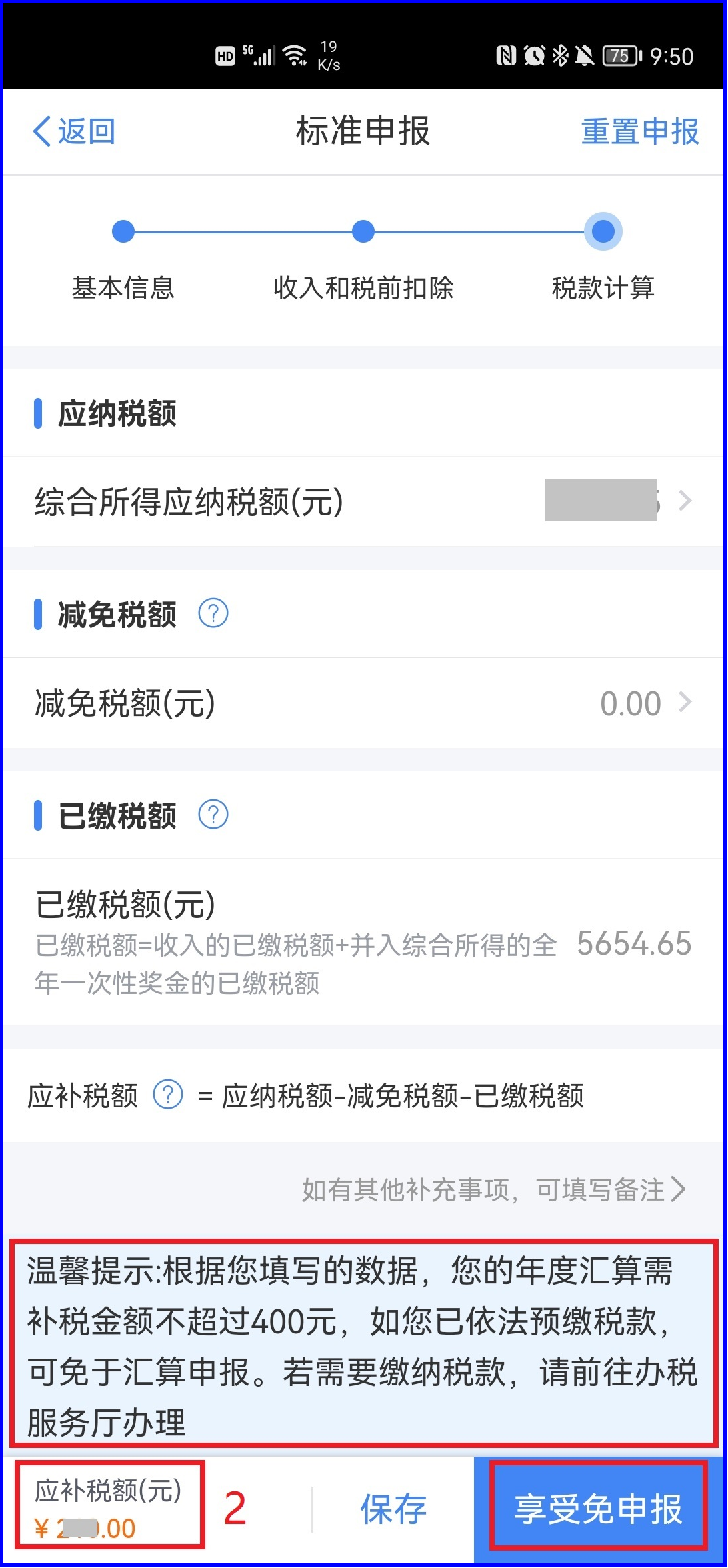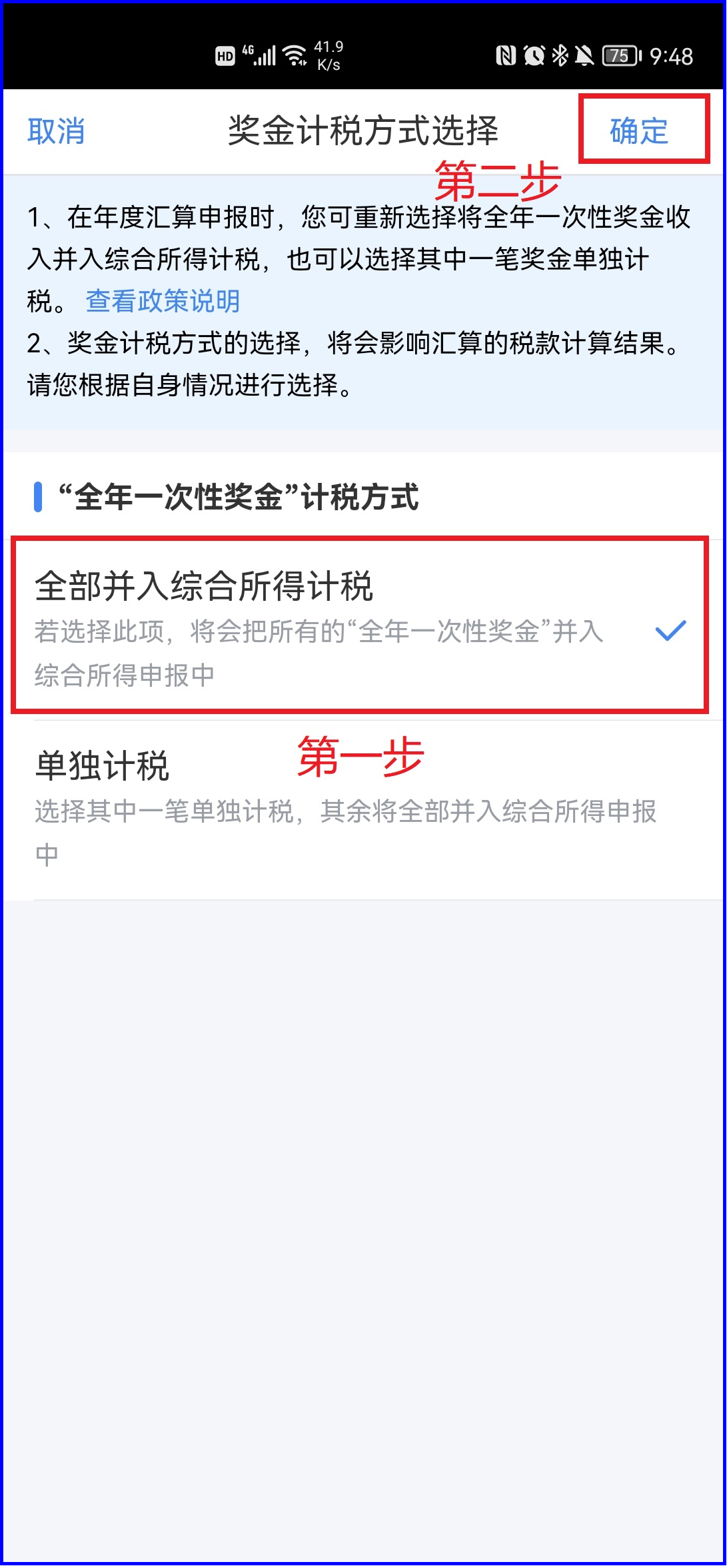 不需要办理的情形: 1) 年度汇算需补税但综合所得收入全年不超过12万元的 2) 年度汇算需补税金额不超过400元的 3) 已预缴税额与年度应纳税额一致的 4) 符合年度汇算退税条件但不申请退税的 需要办理的情形: 1) 已预缴税额大于汇算应纳税额且申请退税的 2) 2023年取得的综合所得收入超过12万元且汇算需要补税金额超过400元的 因适用所得项目错误或者扣缴义务人未依法履行扣缴义务,造成2023年少申报或者未申报综合所得的,纳税人应当依法据实办理汇算。 已预约成功:可直接办理 未提前预约: 1) 3.1-3.20日期间办理需进行预约,在预约的日期办理,预约流程见 https://mp.weixin.qq.com/s/by52p1QC7UT5mNrdq5HbYQ 2) 3.21-6.30日期间办理无需申报,可直接办理。 办理流程: 1、进入“个人所得税APP”首页,有2种方式可进入申报页面: 1) 进入专题页 2) 综合所得年度汇算 2、阅读“标准申报须知(申报表预填服务)”,然后点击“我已阅读并知晓”进入下一步 3、确认“个人基础信息”和“汇算地”是否正确,核对无误后点击“下一步” 4、核对收入纳税数据(工资薪金、劳务报酬、稿酬、特许权使用费) 此处需教职工们需注意,在“工资薪金”处如有“存在奖金,请在详情中进行确认”,则需点击此处确认奖金计税方式,可选择“全部并入综合所得计税”或“单独计税”(老师们可分别选择之后进行后续操作,根据最终汇算结果,选择适合自己的一种即可) 5、若选择“全部并入综合所得计税”,直接点击“确定” 6、若选择“单独计税”,则选择其中一笔金额进行单独计税,然后点击“确定” 7、如本人有劳务报酬、稿酬所得、特许权使用费等收入,可点击右上角“新增”进行收入补充,若无上述收入则直接点击“返回”。 8、返回后依次核对“收入”“费用、免税收入和税前扣除”“专项附加扣除”,如需新增专项附加扣除,可点击此处进行添加。核对无误点击“下一步”,再次确认已填报的信息,确认无误后选择“继续” 9、此处会产生三种结果:不补不退、补税、退税,如本人无需进行补税或退税,则直接点击“提交申报” 10、请于“提交申报/享受免申报/下一步”之前,再次阅读“声明”,确定本人对填报内容(附带资料)的真实性、准确性与完整性负责。 11、如需补税,则存在两种情况:补税金额不超过400元,则可免于汇算申报,直接点击“享受免申报”即可;补税金额超过400元,则直接点击“立即缴税”,选择相应的缴税方式完成支付即可。 12、如需退税,则依次点击“申请退税”“继续退税”,添加本人银行卡信息之后,点击“提交”,选择“继续退税”后即完成申报,等待税务局审核。 13、此时可看到“申报信息提交成功并已保存”,点击下方“查看申报记录”即可看到2023年度综合所得汇算内容,如发现填写错误,点击“退税记录”“撤销退税”,选择撤销退税的原因,点击“提交”进行下一步修改即可。 14、法律责任 如存在应当办理2022年及以前年度汇算补税但未办理,或者经税务机关通知2022年及以前年度汇算申报存在疑点但未更正或说明情况的,需在办理2022年及以前年度汇算申报补税、更正申报或者说明有关情况后依法申请退税。 汇算需补税的纳税人,汇算期结束后未申报补税或未足额补税的,一经发现,税务机关将依法责令限期改正并向纳税人送达有关税务文书,对已签订《税务文书电子送达确认书》的,通过个税APP及网站等渠道进行电子文书送达;对未签订《税务文书电子送达确认书》的,以其他方式送达。同时,税务机关将依法加收滞纳金,并在其个人所得税《纳税记录》中予以标注。 纳税人因申报信息填写错误造成汇算多退或少缴税款的,纳税人主动或经税务机关提醒后及时改正的,税务机关可以按照“首违不罚”原则免予处罚。 根据《财政部 税务总局 住房城乡建设部关于延续实施支持居民换购住房有关个人所得税政策的公告》(2023年第28号)规定,在2024年1月1日至2025年12月31日期间,纳税人出售自有住房并在现住房出售后1年内,在同一城市重新购买住房的,可按规定申请退还其出售现住房已缴纳的个人所得税,具体服务与征管规定参照《国家税务总局关于支持居民换购住房个人所得税政策有关征管事项的公告》(2022年第21号)执行。 联系人:朱老师 电话:0990-6633073