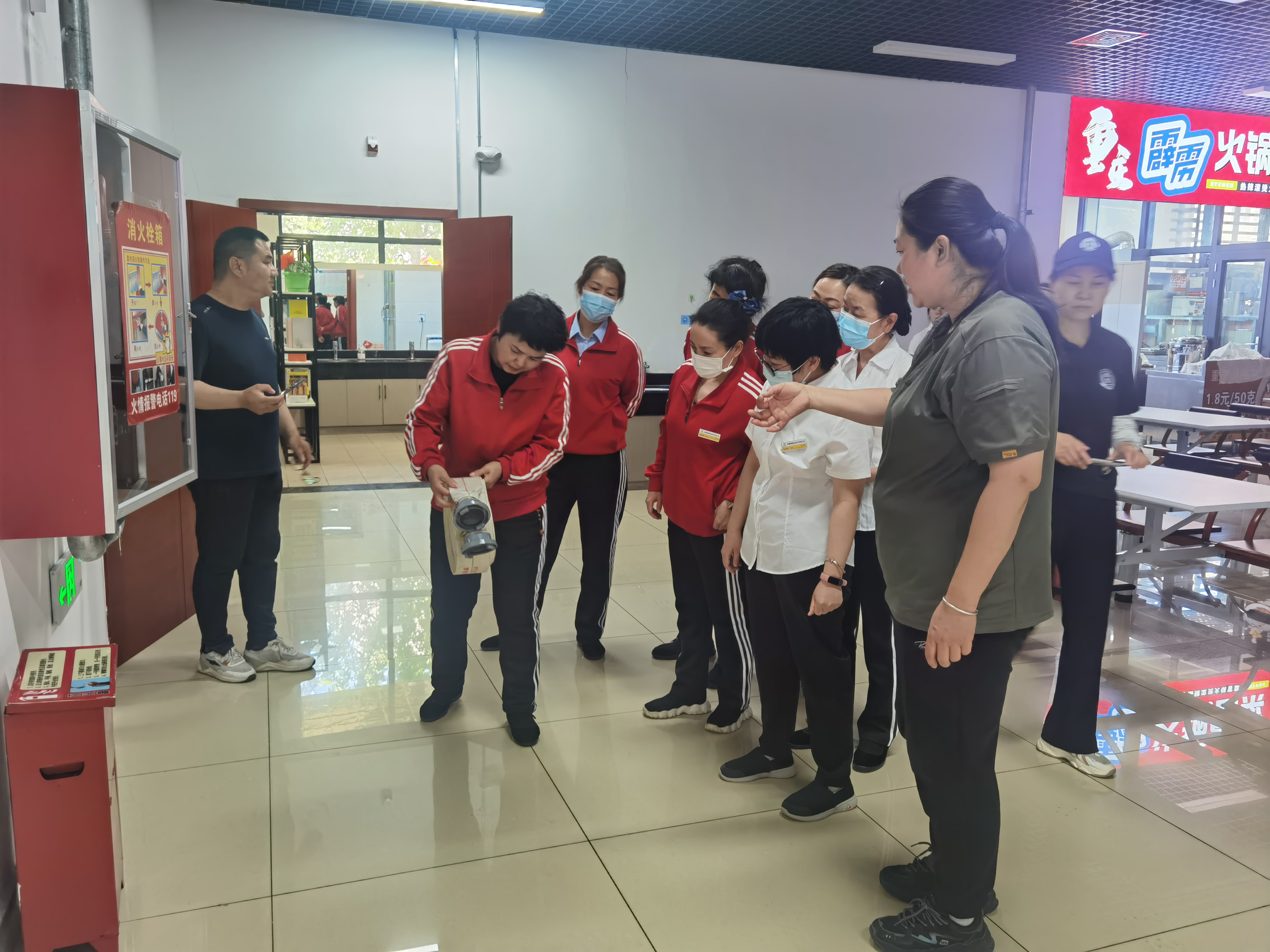 理论培训结束后,参训人员在第三学生餐厅前广场开展灭火实战演练。专业人员介绍灭火器、消防栓等器材的使用方式和要领,演练现场设置模拟火点,食堂、物业、安保、宿管等工作人员分批使用消防器材进行灭火演练。