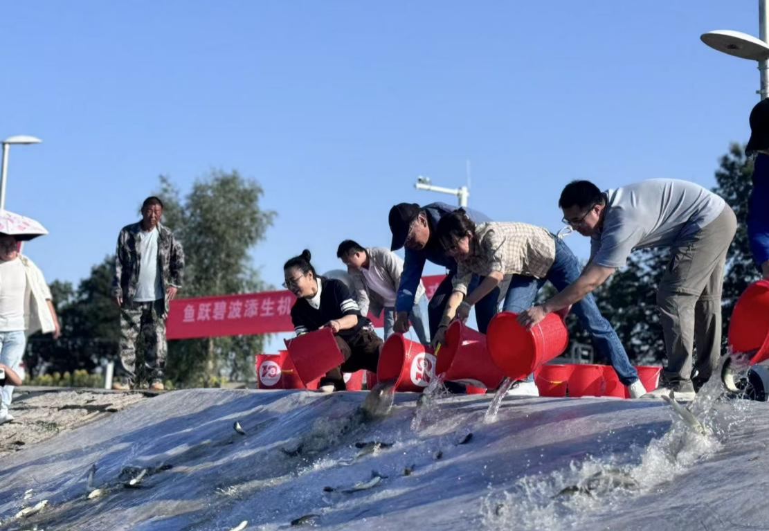 活动现场,一辆满载鲜活鱼种的运输车稳稳停靠在红山湖岸边。现场师生们接过满鱼苗的水桶,缓缓倾斜桶体,“哗啦——”清脆的水声在湖畔响起,一条条小鱼灵动欢快地从桶中跃出,尾鳍一摆便扎进水中迅速朝着湖心、芦苇丛等四面八方畅快游去,澄澈的湖面瞬间因这些小生命的加入,焕发出蓬勃生机。