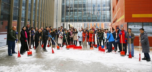 当天,校园里多了一批手持铁锹、铁铲、推雪板、扫帚的人。近70名教职工,100多分钟,5条路,200余米,一个中午,冒着零下的温度,热火朝天的劳动大军遍布在校区内公交站附近、C6楼北门前、K3公寓周边……他们摘掉了帽子,脱去了手套,拉开了外套的拉链,依旧止不住滑落脸庞的汗滴;校区领导悉数参加,率先垂范;老师们相互协作,彼此鼓励,有轮流休息的人却没有停下来的工具,“坚持坚持再坚持,向前向前再向前”,一条条路面在老师们的辛勤努力下现出本来面目,逐一贯通至主干道。特殊的日子,老师们选择了特别的纪念方式,为校区师生出行创造便利的同时给参加活动的老师们留下了一份难忘的回忆。