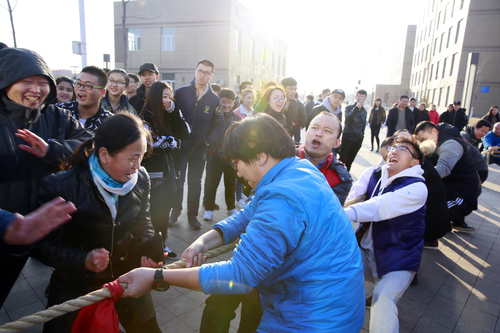 在品尝了美味可口的“诺鲁孜饭”后,两校各派出12名教职工组成的拔河队伍进行了友谊赛。