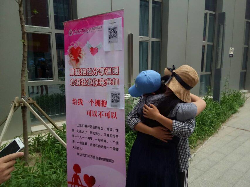 5月25日,在C6教学楼前,心语社开展了“朋辈抱抱”活动,给前来咨询或路过的同学送上来自朋辈的温暖拥抱,在同学中传递敞开胸怀,感受关爱,消除人与人之间的猜疑、警惕、冷漠与隔离的信息。同时,学生工作与安全保卫部邀请市人民医院心理科及市心理健康教育及心理咨询协会的四位专家为同学们提供了现场心理咨询和心理测量活动。