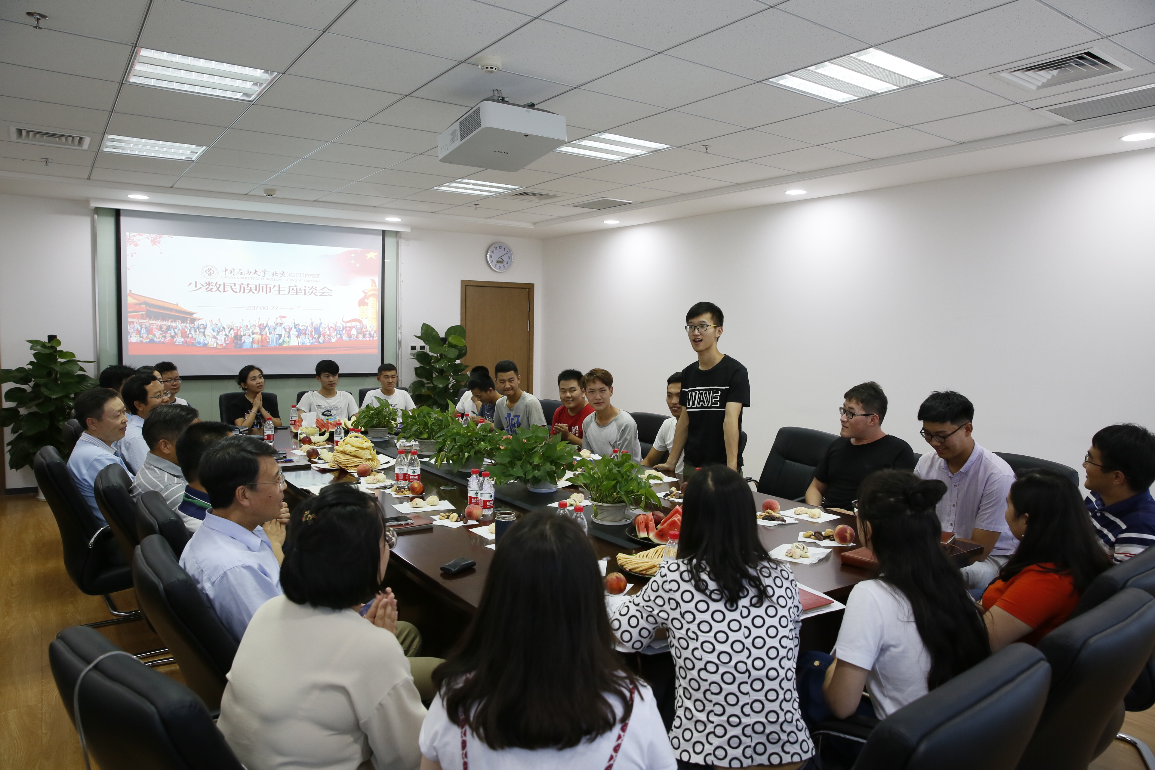 6月27日下午,中国石油大学(北京)克拉玛依校区在J1Ⅰ901会议室召开以“共庆肉孜节·民族团结一家亲”为主题的少数民族师生座谈会。在校区的全体管委会领导、石油学院领导、少数民族职工及部分少数民族学生代表共7个民族的26名师生参加了座谈会。党群工作部主任肖中琼主持会议。