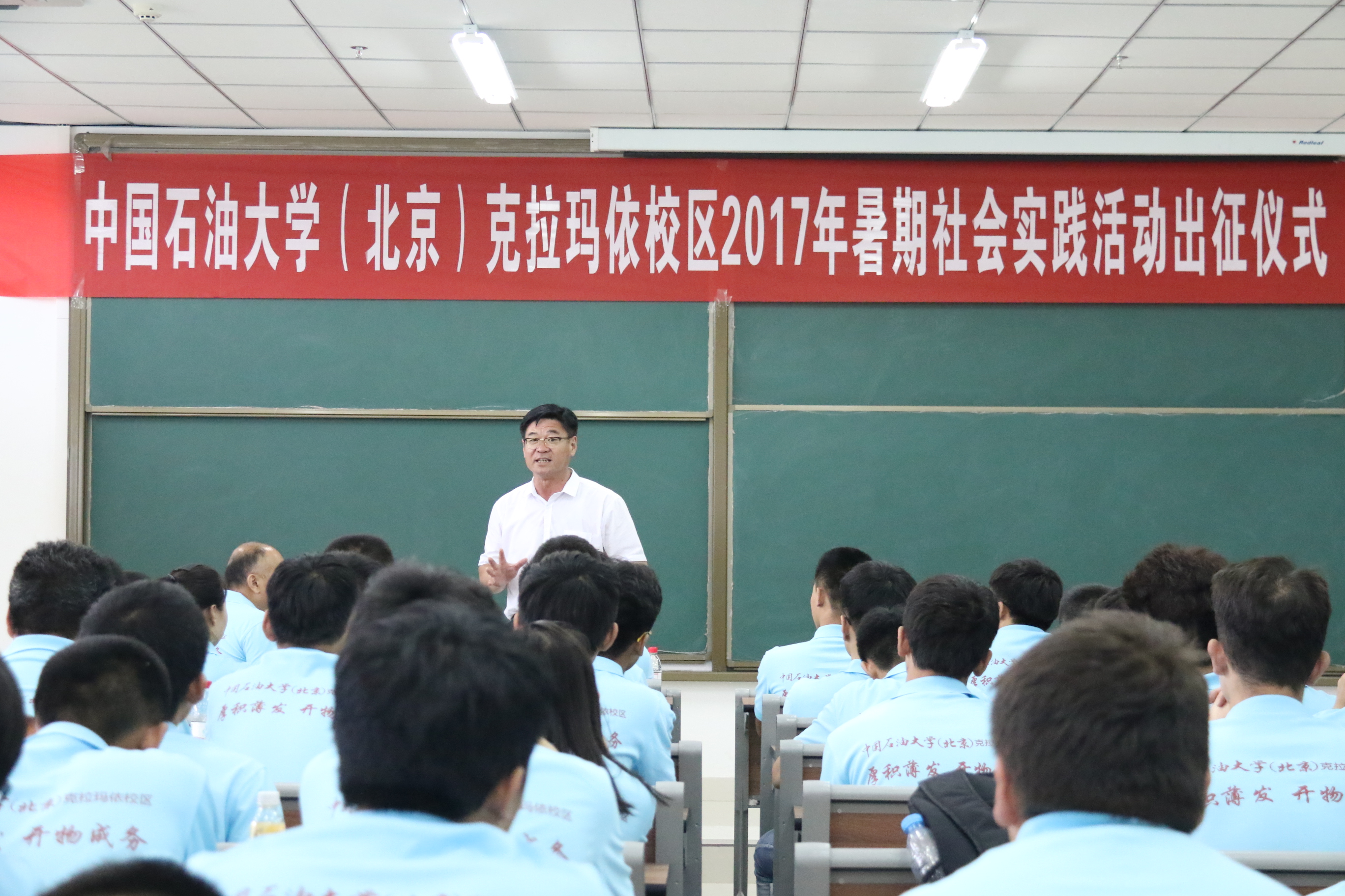 6月30日下午,中国石油大学(北京)克拉玛依校区在C6楼I305举办2017年暑期社会实践活动出征仪式。校区党工委常务副书记陈桂刚、学生工作与安全保卫部主任姜立国、各学院专职副书记、社会实践带队老师、辅导员及学生队员等近110人参加本次活动,仪式由学生工作安全保卫部刘凡瑀主持。