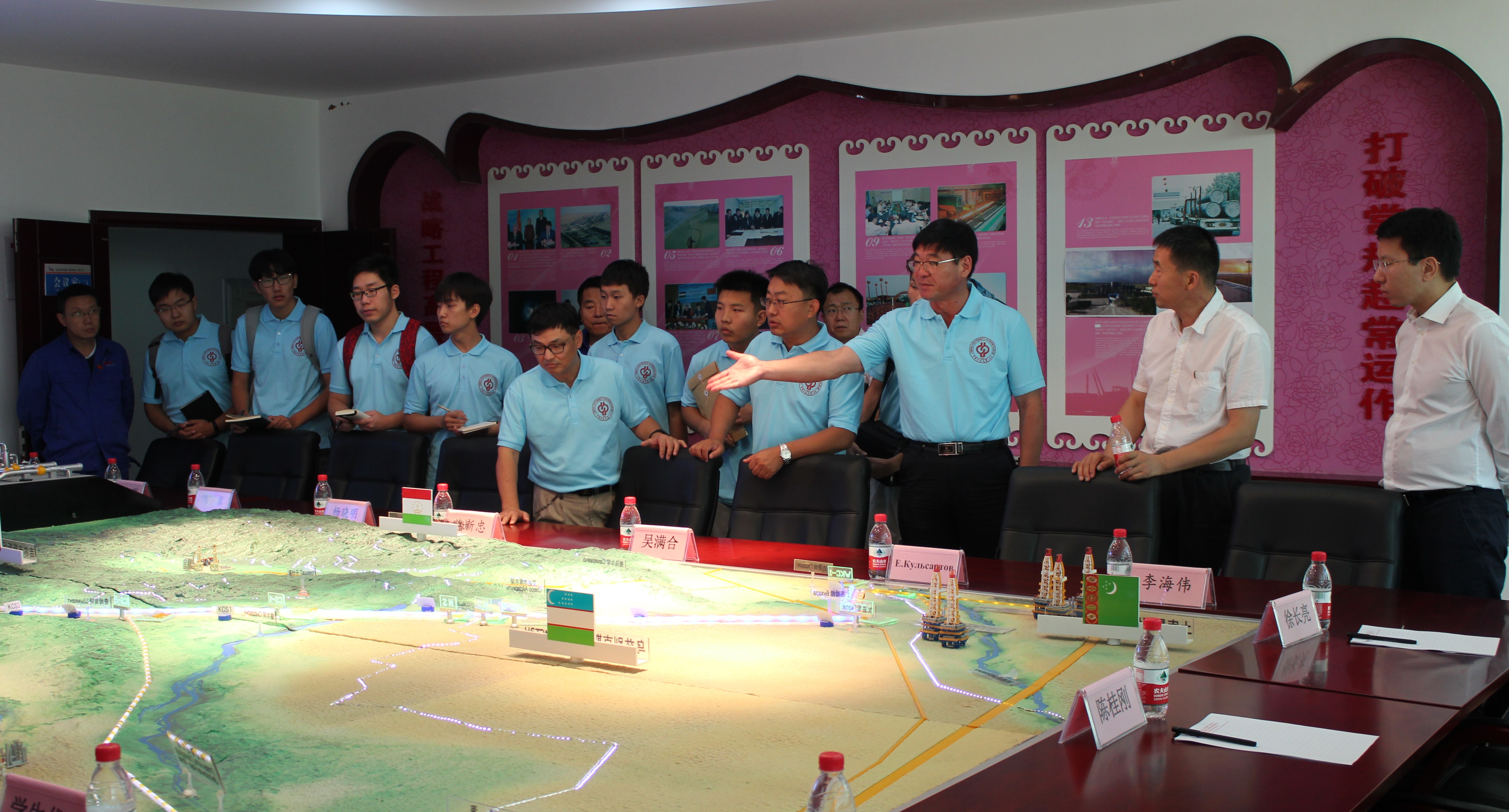 中亚天然气管道霍尔果斯计量站总经理李海伟、副总经理叶尔克(哈萨克斯坦籍,Yerkin Kulsartov)等企业领导和校友代表热情接待了陈桂刚一行,并详细介绍了霍尔果斯计量站作为中亚天然气进入中国境内第一站的重要功能及战略意义。作为优秀校友,李海伟(采85)、叶尔克(留学生,自动化04)鼓励同学们在校期间不仅要努力学习理论知识,夯实基础,同时要积极参与实习实践活动,提升综合素质,在学习和工作中继承和发扬石油精神。