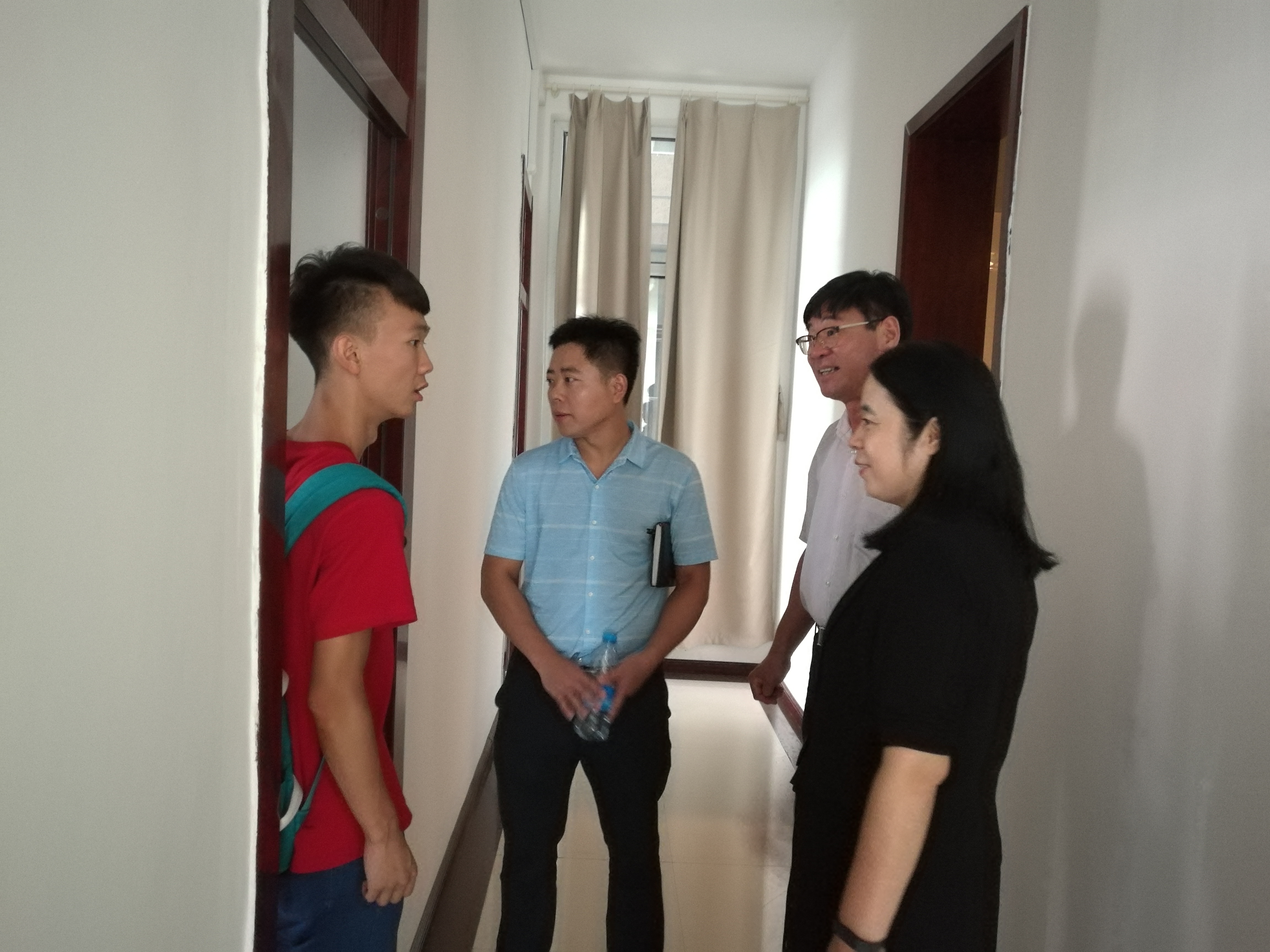 一行人还走访了新生即将入住的三栋学生宿舍楼。陈桂刚与新生及家长们亲切交谈,代表校区对新生们表达了欢迎与祝贺,表示有任何问题都可以向校区反映,校区将努力妥善解决;张红艳检查了宿舍入住条件,要求排查水电问题,确保学生安全与入住顺利。