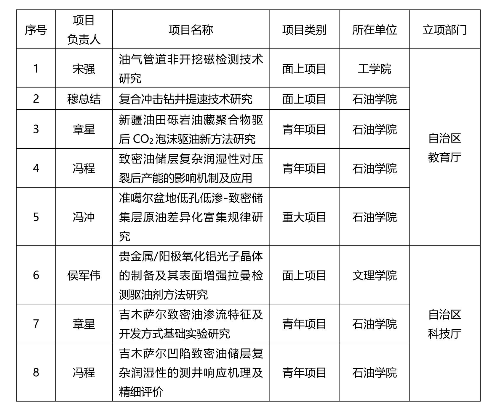 ——八项自治区级项目获得立项。日前,新疆维吾尔自治区教育厅发布《关于对2017年度自治区高校科研计划拟支持项目公示的通知》,校区有5项项目获得立项,其中重大项目1项,面上项目2项,青年项目2项。新疆维吾尔自治区科技厅发布《关于对2017年自治区创新环境(人才、基地)建设专项-自然科学基金项目进行公示的通知》,校区有3项项目获得立项,面上项目1项,青年项目2项。具体名单见下表:
