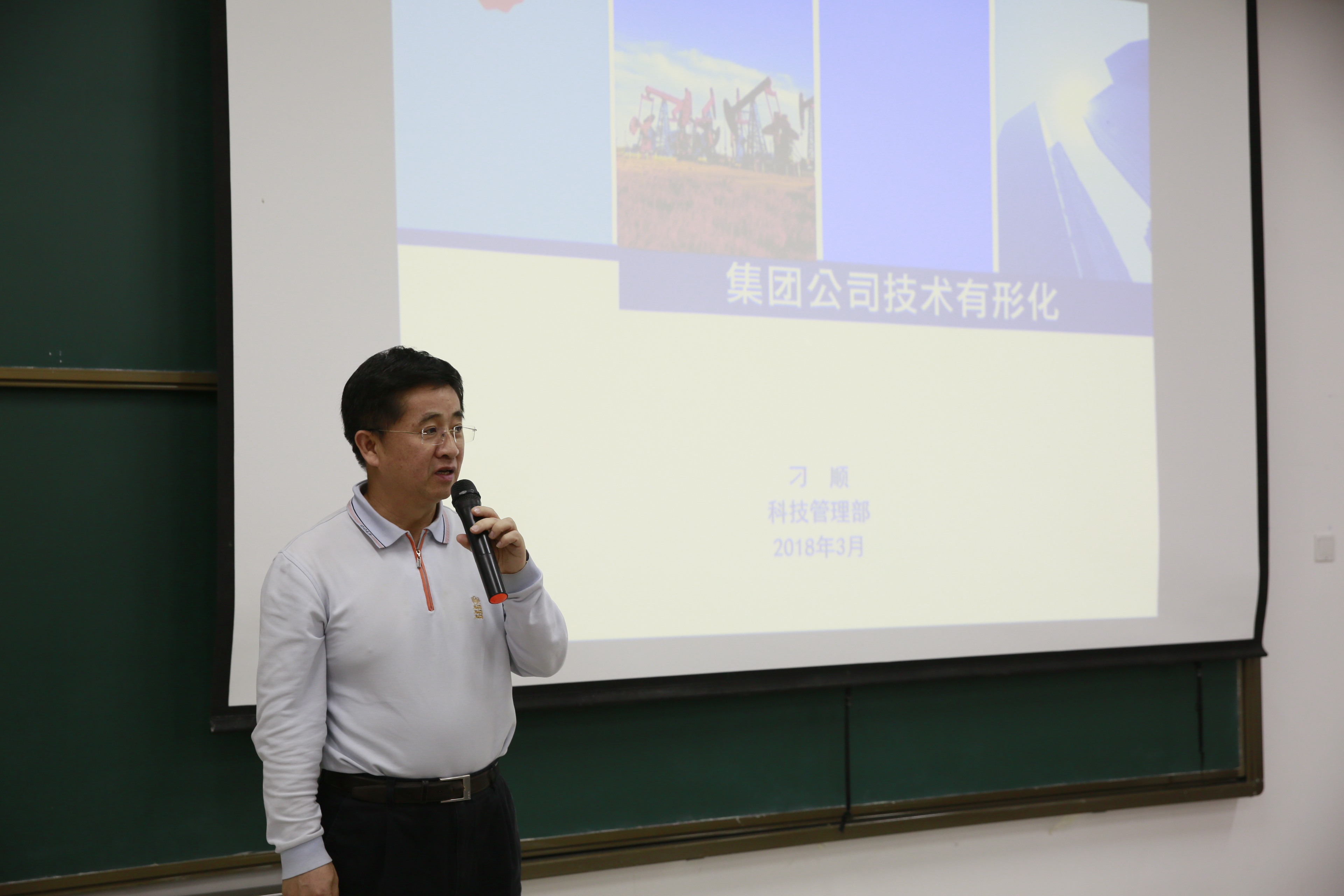 刁顺详细介绍了集团公司技术有形化的总体方案、有形化流程、有形化任务、目标、推广应用成效等,与在场师生分享了职业生涯经验和感悟,对克拉玛依校区建设提出了意见建议,。