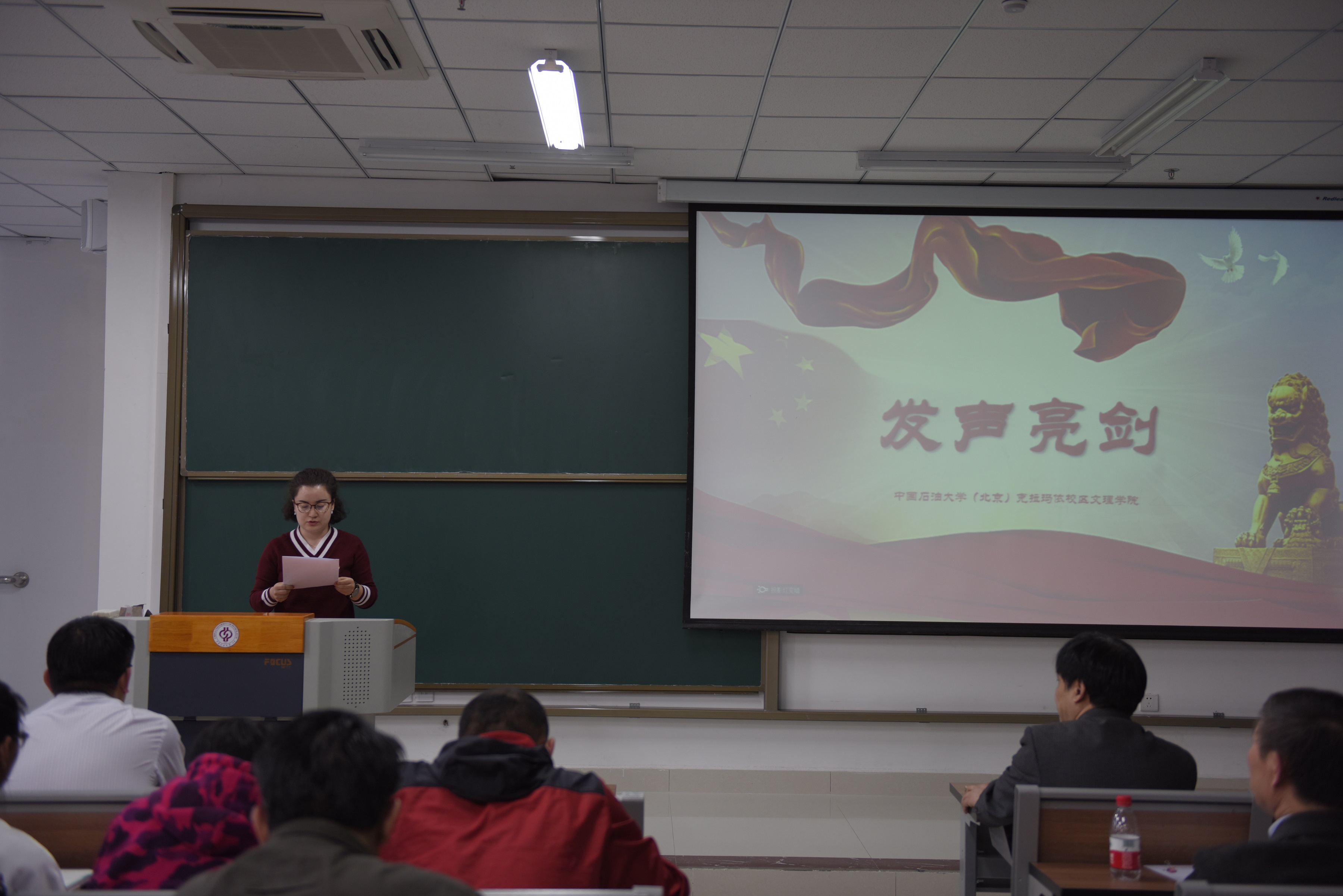4月12日下午,中国石油大学(北京)克拉玛依校区文理学院组织全体教职工开展集中学习暨“发声亮剑”活动。校区党工委常务副书记陈桂刚、管委会常务副主任孙旭东、管委会副主任肖磊、总会计师张红艳,相关职能部门负责人及文理学院全体教师参加了此次活动。活动由文理学院院长张毅教授主持。