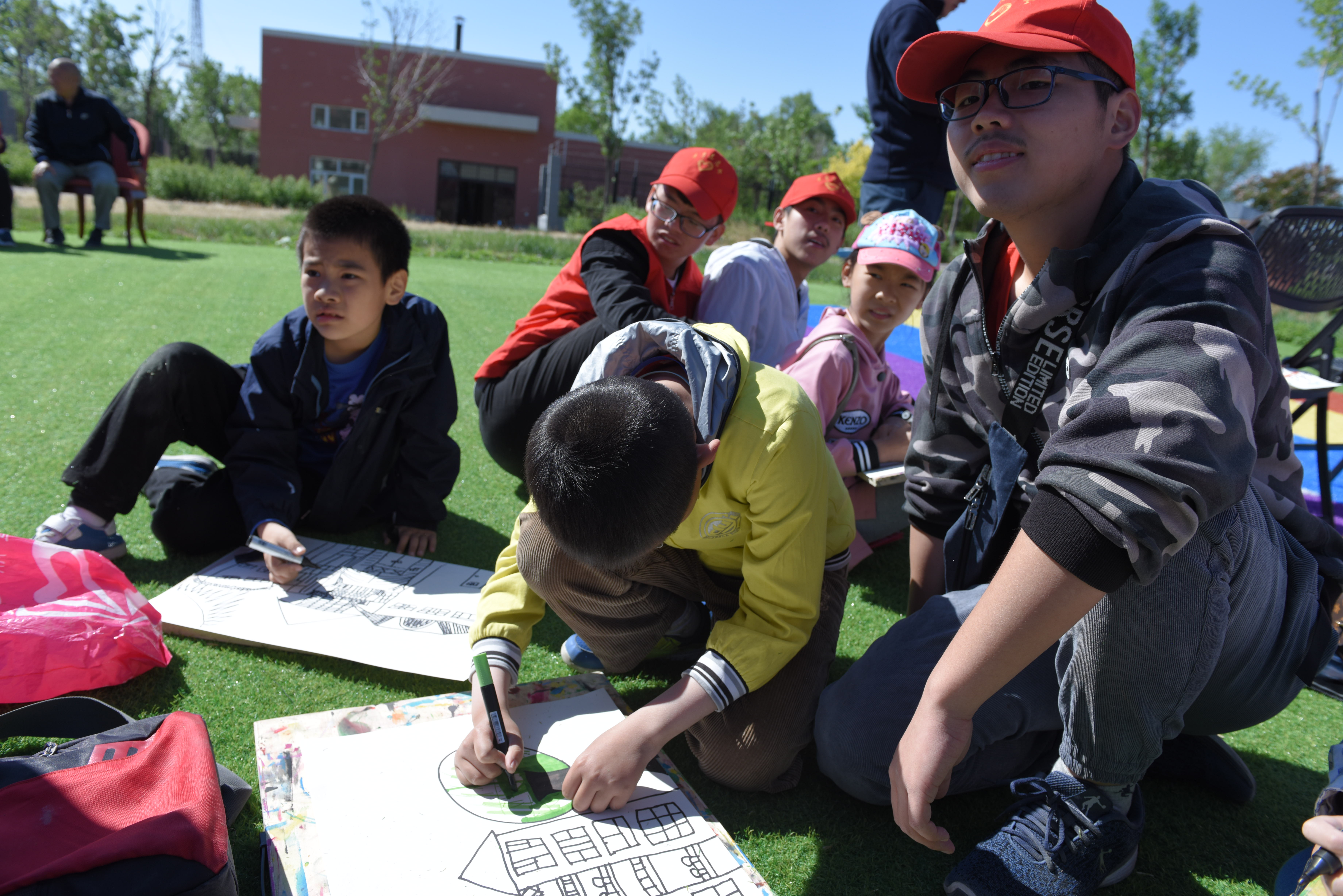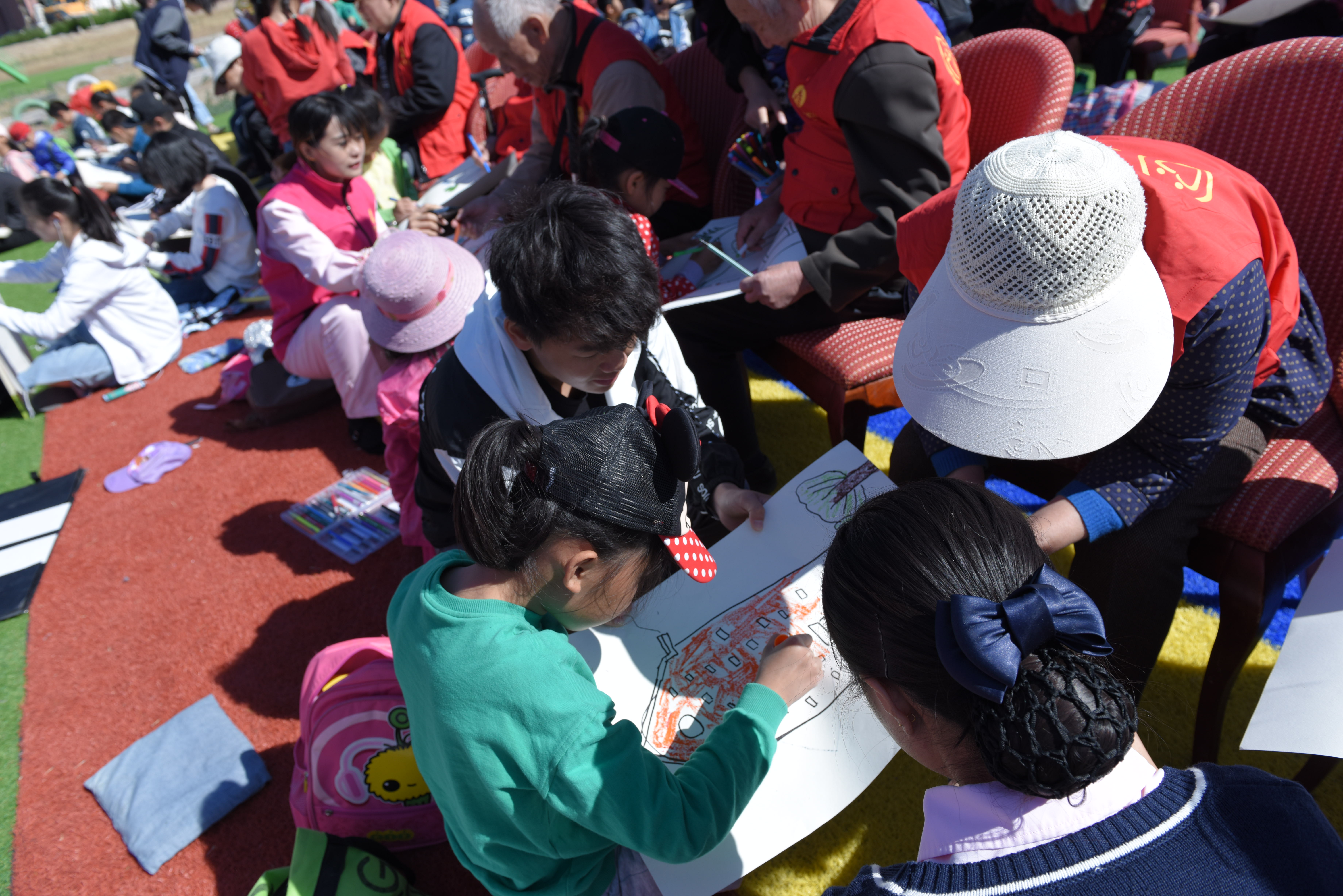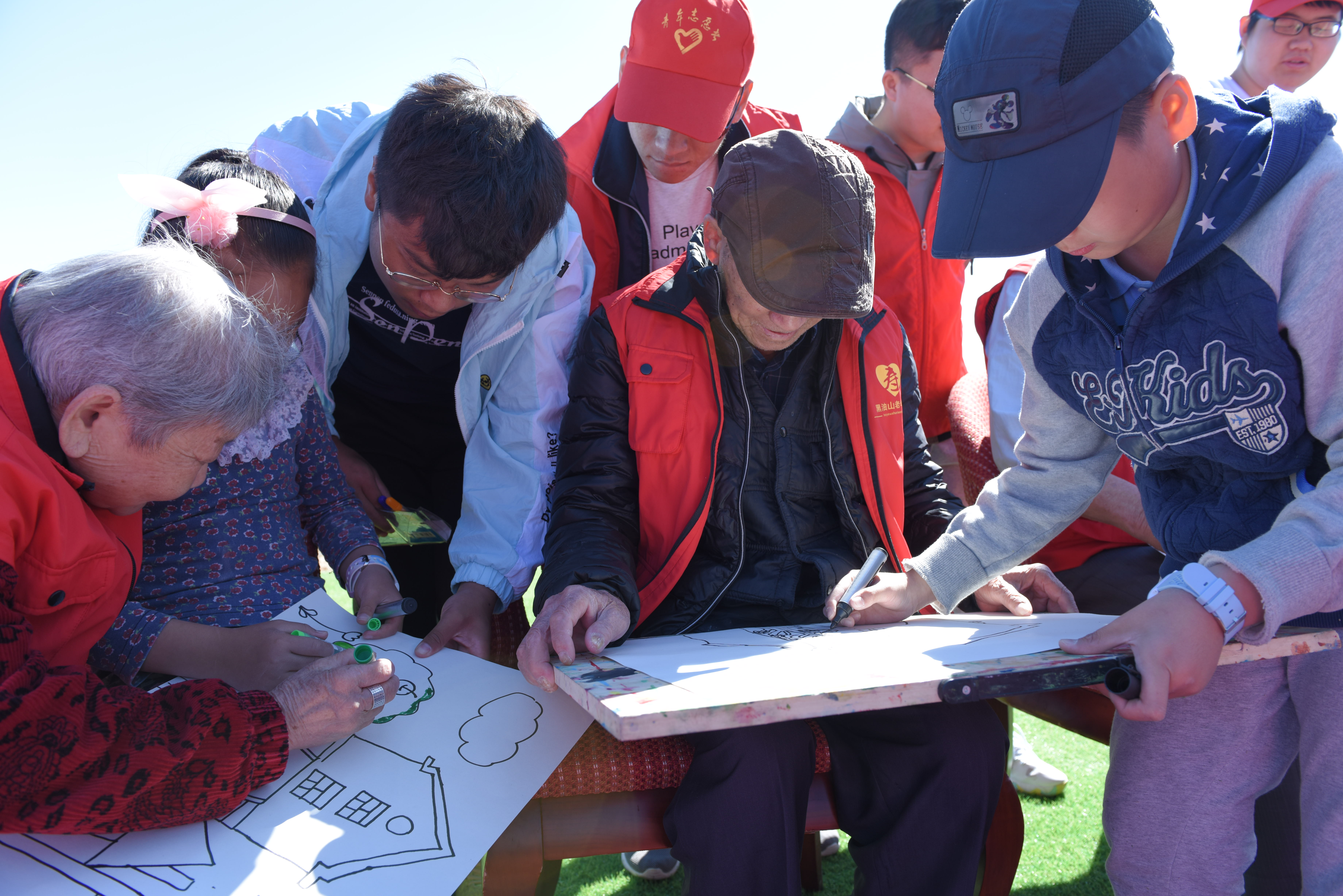 为保证活动的顺利进行,校区志愿者们早早赶到黑油山老年公寓,协助工作人员一起布置现场、搬运物品,搀扶老人们走到室外的活动地点。活动现场,热闹非凡,在志愿者们的协助下,一百多对青少年宫的小朋友与黑油山老年公寓的老人共同完成了一幅幅充满童趣、色彩鲜艳的画作。