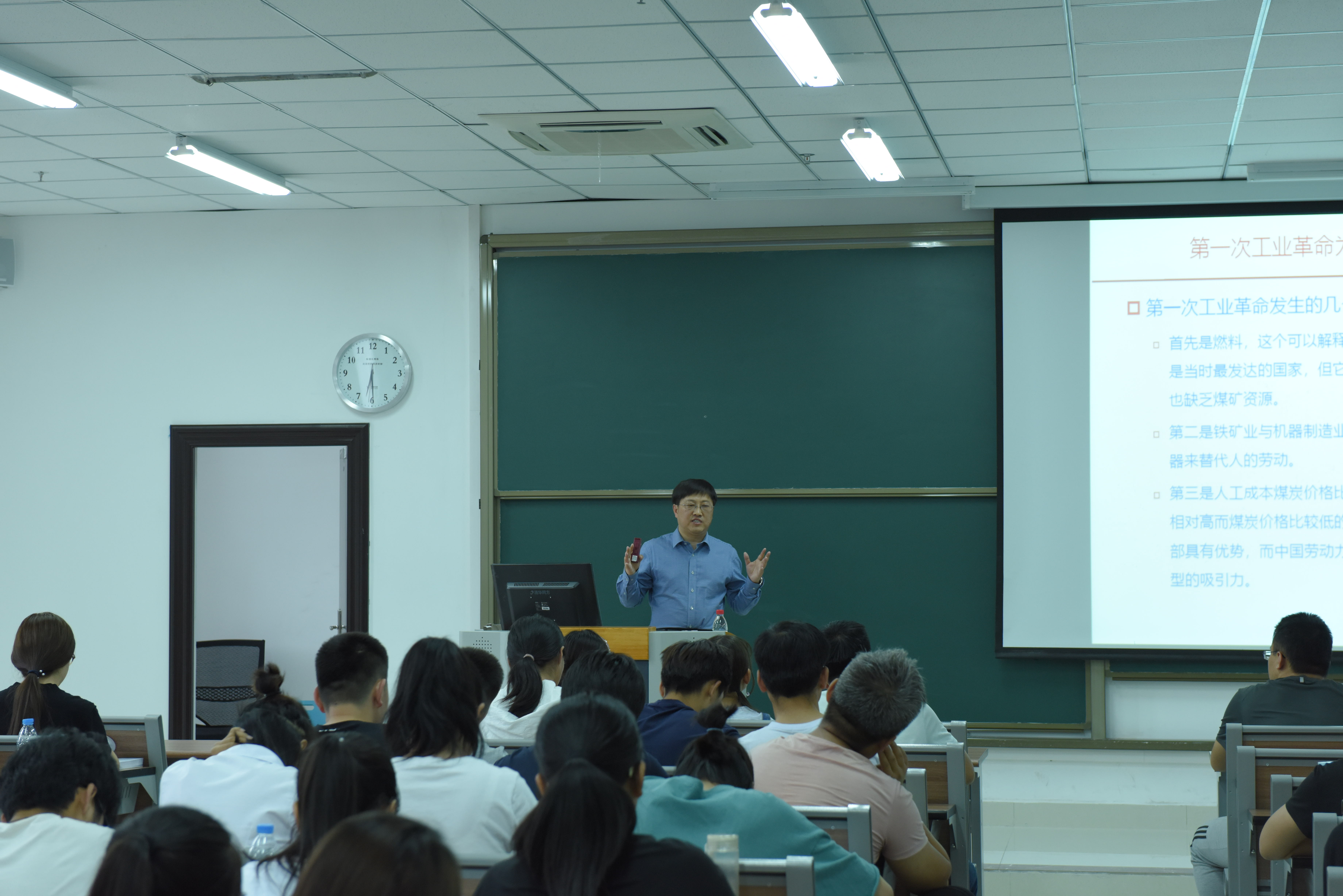 王震博士从工业革命与能源代际更迭入手,结合经济方面的专业知识和能源转型发展战略,从全球视角给学生讲解分析了能源转型新时代高质量发展体系。他深入浅出地阐述了清洁低碳安全高效的能源体系,介绍了天然气在未来的开发潜力,并为同学们提供了未来职业发展的建议。