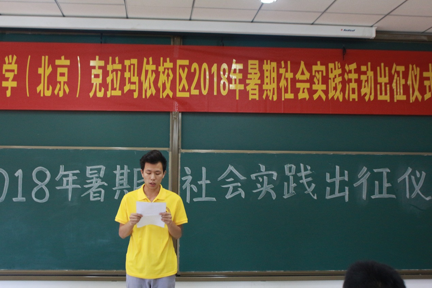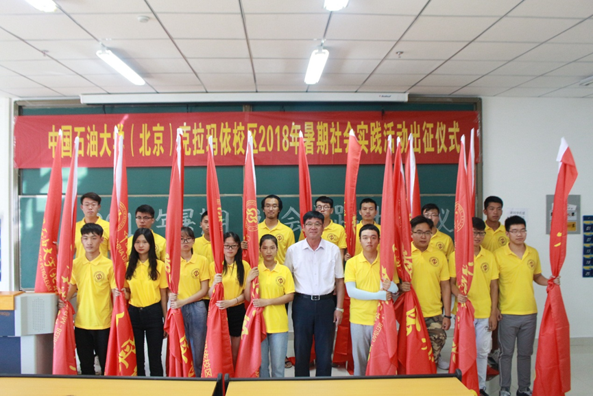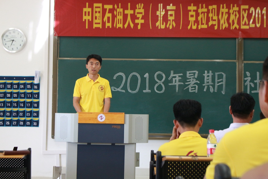 7月6日下午,中国石油大学(北京)克拉玛依校区在C6楼I405教室举办2018年暑期社会实践活动出征仪式。校区党工委常务副书记陈桂刚、各学院专职副书记、暑期社会实践带队老师、辅导员及学生队员等近160人参加了本次活动,活动由学生工作与安全保卫部主任姜立国主持。