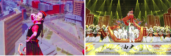 第四篇章“新时代征程再谱新篇”以中国石油大学时期为背景,全面呈现了中国石油大学作为石油人才的摇篮,在人才培养和服务国家能源战略方面取得的累累硕果。克拉玛依校区同学们表演的舞蹈《美丽的克拉玛依姑娘》以优美的旋律、曼妙的舞姿演绎了石大学子的青春朝气。留学生表演的歌舞《丝路欢歌》,用独具民族特色的歌舞展现了别样的民族风情和异域文化,体现了石大在服务国家“一带一路”建设中的办学成果。