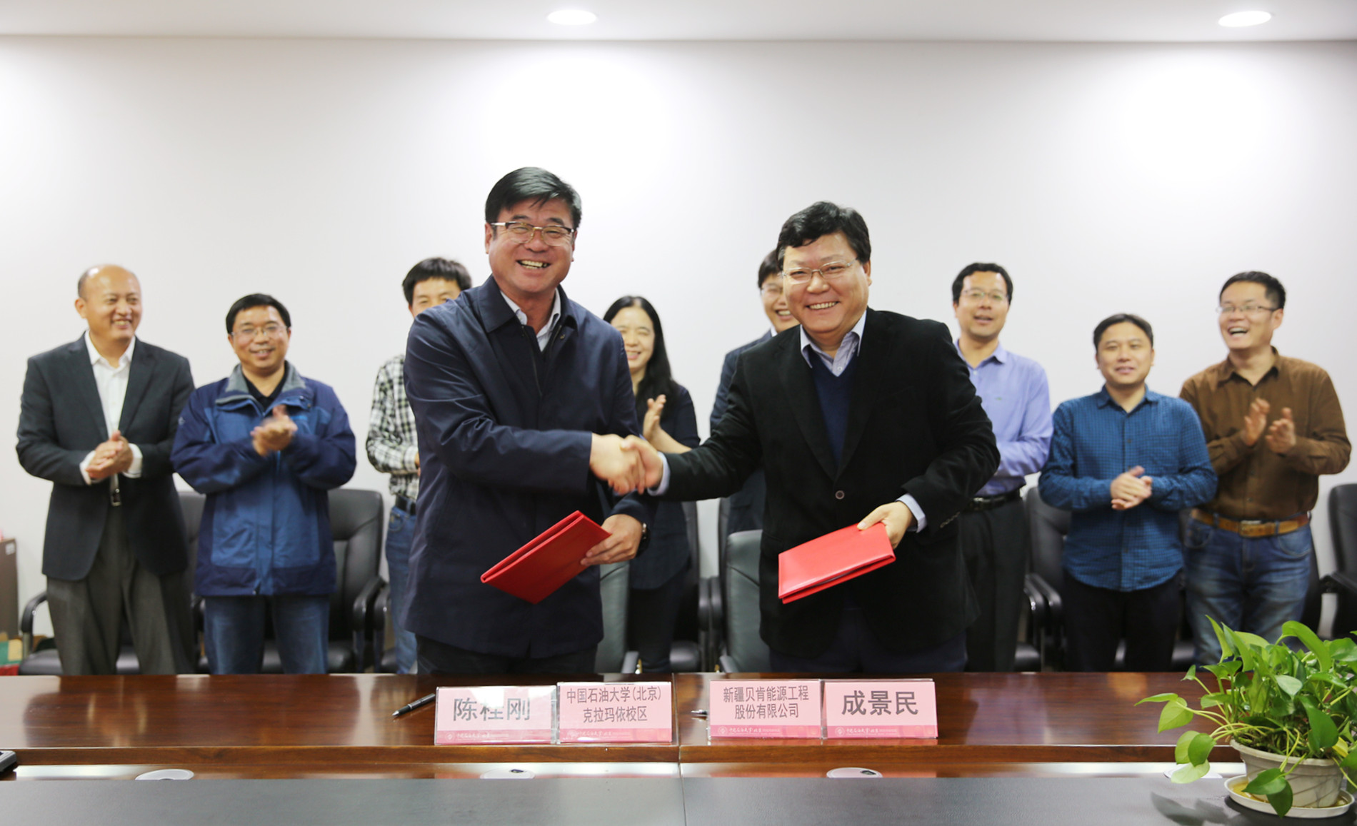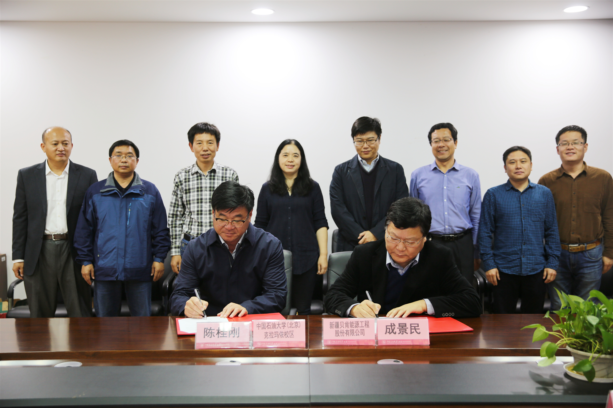 11月9日下午,新疆贝肯能源工程股份有限公司与中国石油大学(北京)克拉玛依校区捐赠协议签约仪式在校区J1楼Ⅱ901举行。新疆贝肯能源工程股份有限公司执行总裁成景民一行4人,校区党工委常务副书记陈桂刚,总会计师张红艳,相关职能部门和学院负责人参加了捐赠协议签约仪式。成景民和陈桂刚分别代表企校双方在协议上签字。
