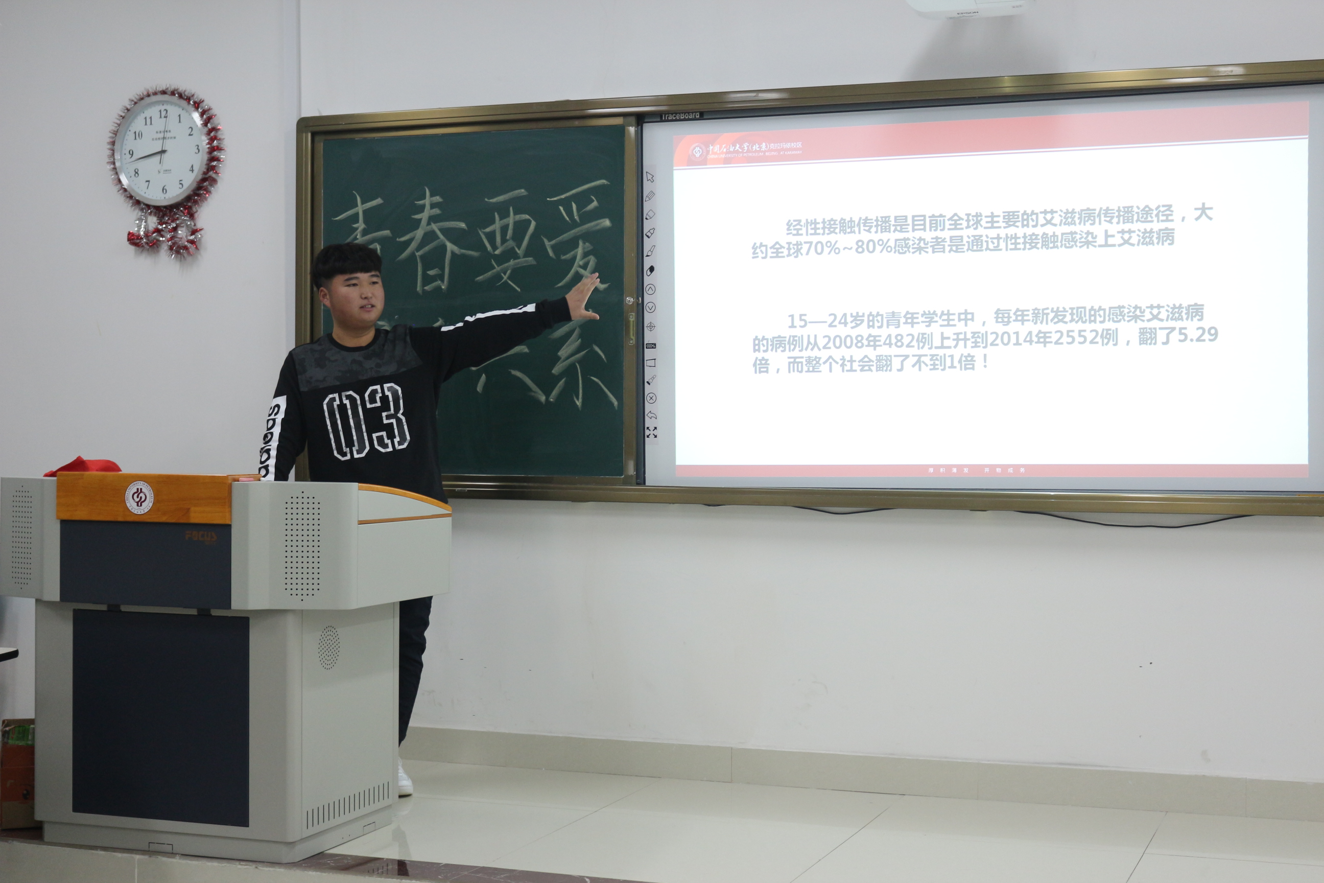 2018年12月1日是第31个“世界艾滋病日”,为进一步提高大学生防艾意识,做好校区防艾工作, 11月19日,中国石油大学(北京)克拉玛依校区文理学院青年志愿者协会在C5教学楼举办了“青春要爱不要艾 携手共系红丝带”防艾宣讲活动。