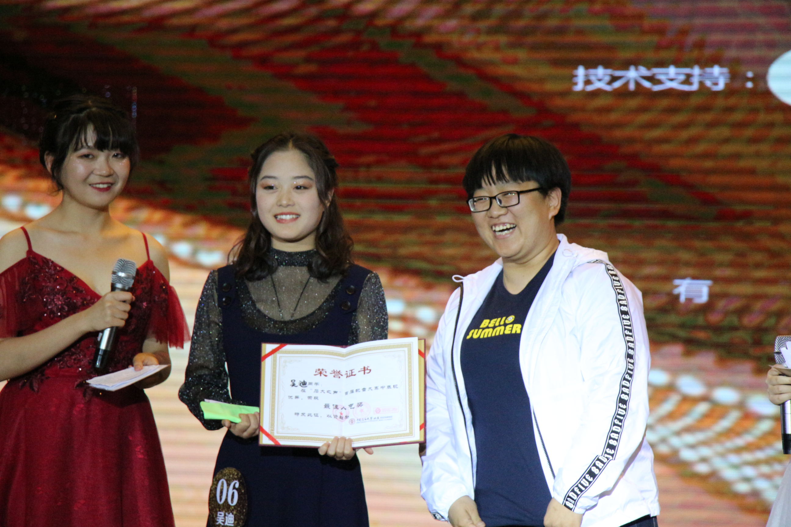 大赛最后,评委老师上台分别为最佳人气奖吴迪、季军吴李艳、亚军石子扬以及冠军杨媛颁发奖杯与荣誉证书。广电中心主持人丁艺老师在点评中对大赛的筹备与参赛选手的水准表达了高度的肯定与赞扬,同时希望“石大之声”配音大赛能够成为学校的经典品牌一届比一届精彩越办越好,在欣赏中一起感动,在感动中一起回味,在回味中一起品读,重温经典作品,领略声音的魅力。