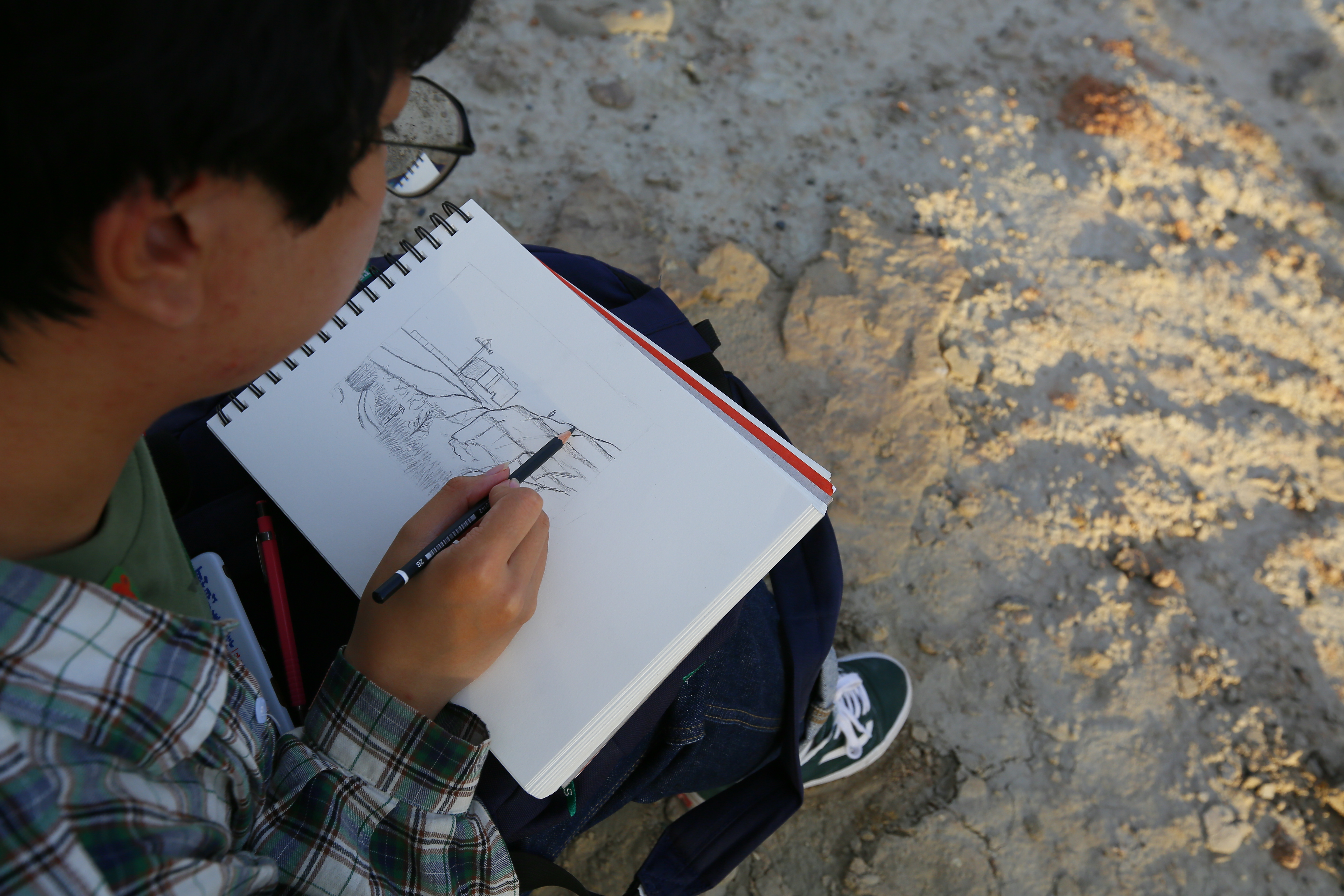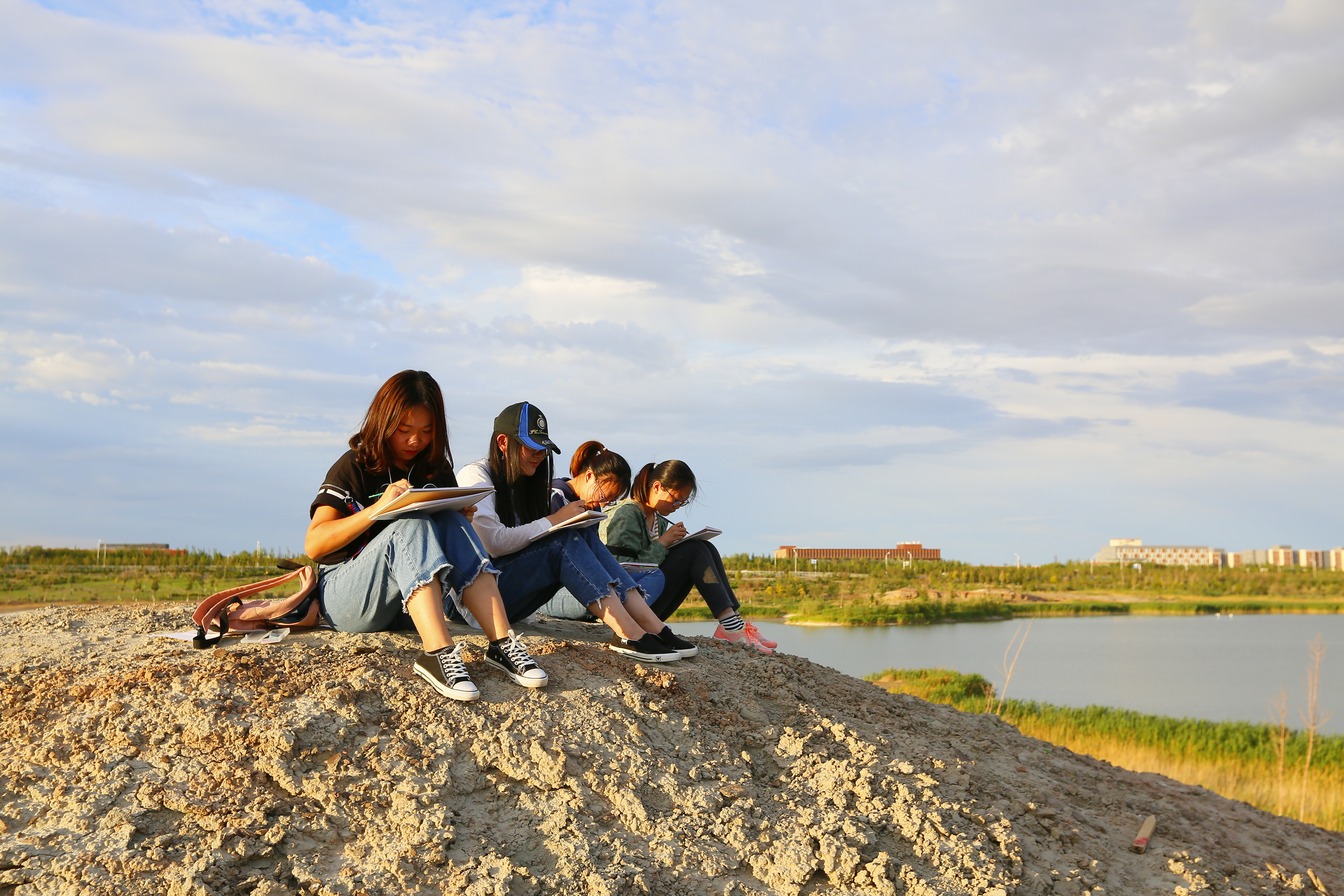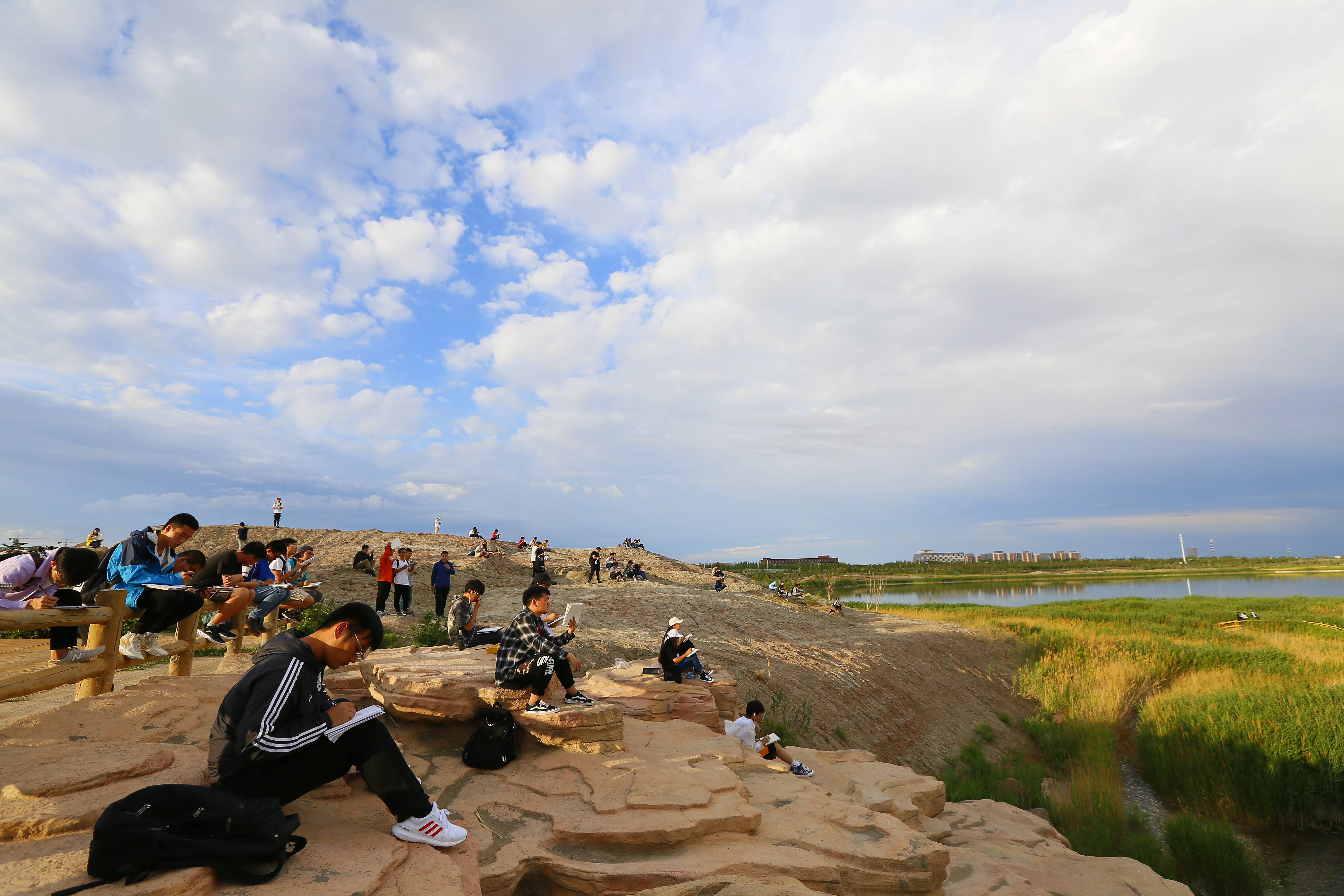 在勘察现场,地质系能源老师从地质专业角度为同学们讲解了红山湖露头形成的地质条件和地质特征、野外地质素描的基本格式和构图要素以及克拉玛依油田的发现历史。党群工作部张宝老师从野外地质素描的角度为同学们介绍了如何利用“块面分析法”在野外进行选景构图、以及光线变化对于“五大调子”的影响。随后,同学们纷纷选取不同的角度,对红山湖露头、校园风光进行了野外地质素描写生。