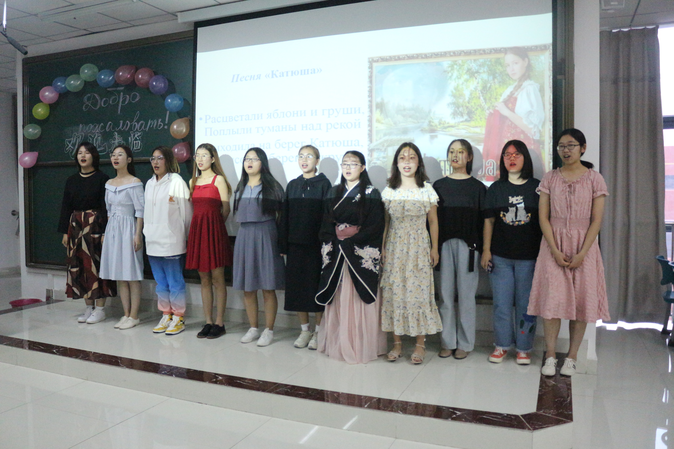 联谊会面向全体俄语专业学生,近50位学生参加此次活动中的晚会表演。元宝·加斯那老师为新生致辞,主持人以俄文主持整场晚会。晚会中学生们以经典歌曲和舞蹈为主线,中间穿插互动游戏,最后以集体合唱《喀秋莎》落幕。