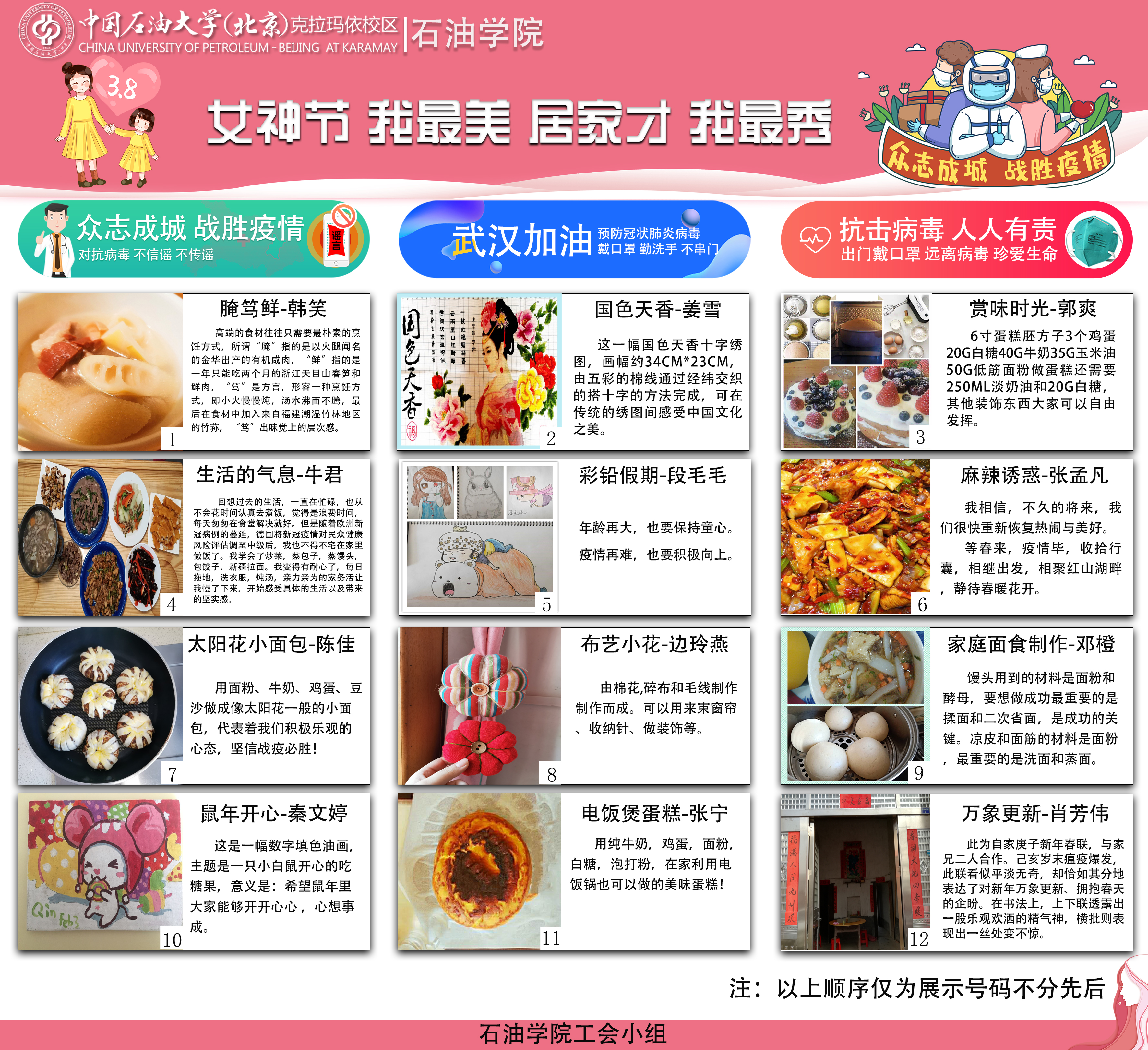 阳春三月,春回大地,为了进一步关爱女教职工,活跃居家文化生活,继续开展防控疫情教育宣传,石油学院工会线上开展以“女神节,我最美,居家才,我最秀”为主题的“三八”国际妇女节居家才艺展示活动。