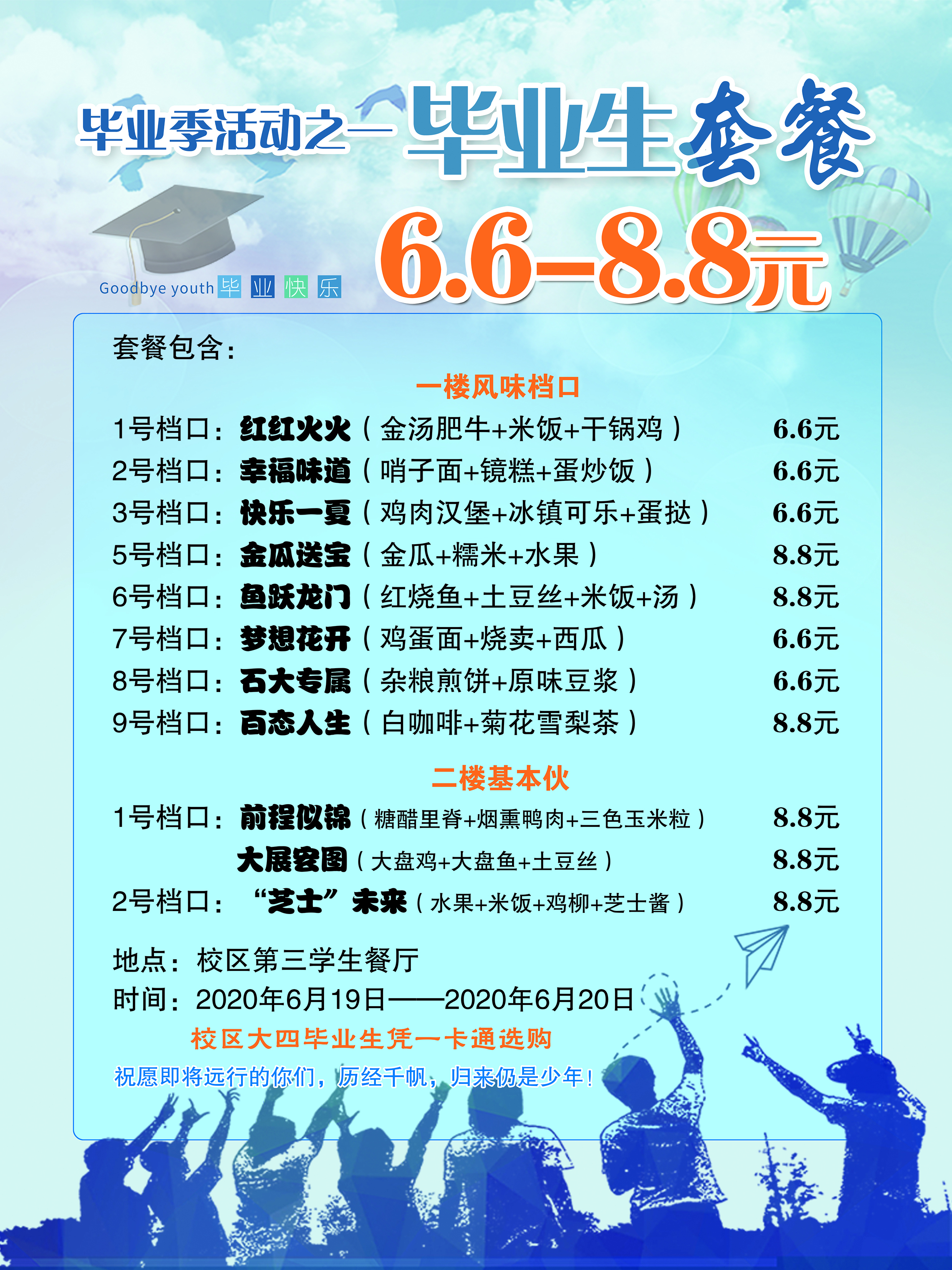 在校区的菁菁校园里,唯有爱与美食不可或缺,财务与校园管理部为即将迈出校园大门的毕业生们,准备了寓意美好的首届“毕业生套餐”。活动持续到6月24日,校区第三学生餐厅每个档口都为毕业生推出了“红红火火”、“鱼跃龙门”、“前程似锦”等专属套餐,每一份套餐,都包含了校区食堂员工们对毕业生满满的祝福。