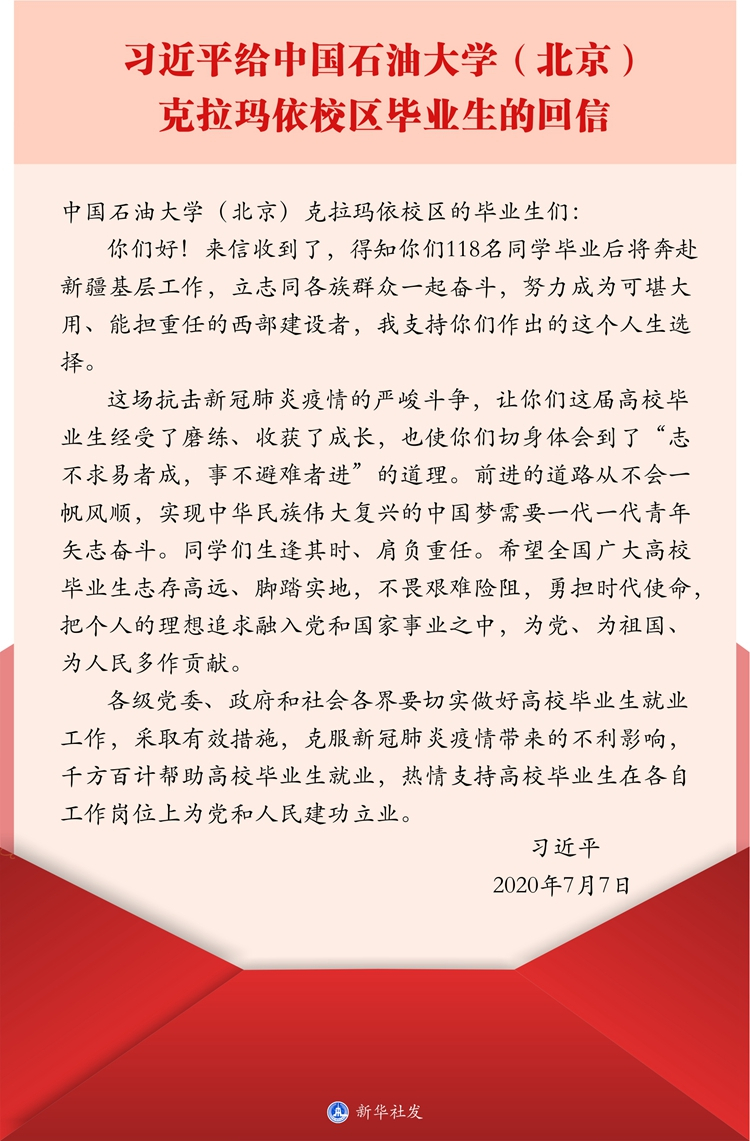这封饱含支持鼓励、殷切期望、信任重托和谆谆教诲的回信,不但带给中国石油大学(北京)克拉玛依校区118名向总书记表达扎根新疆基层奋斗的首届毕业生极大的鼓舞,更激励着数万名克拉玛依各大中小学的学生志存高远、脚踏实地。