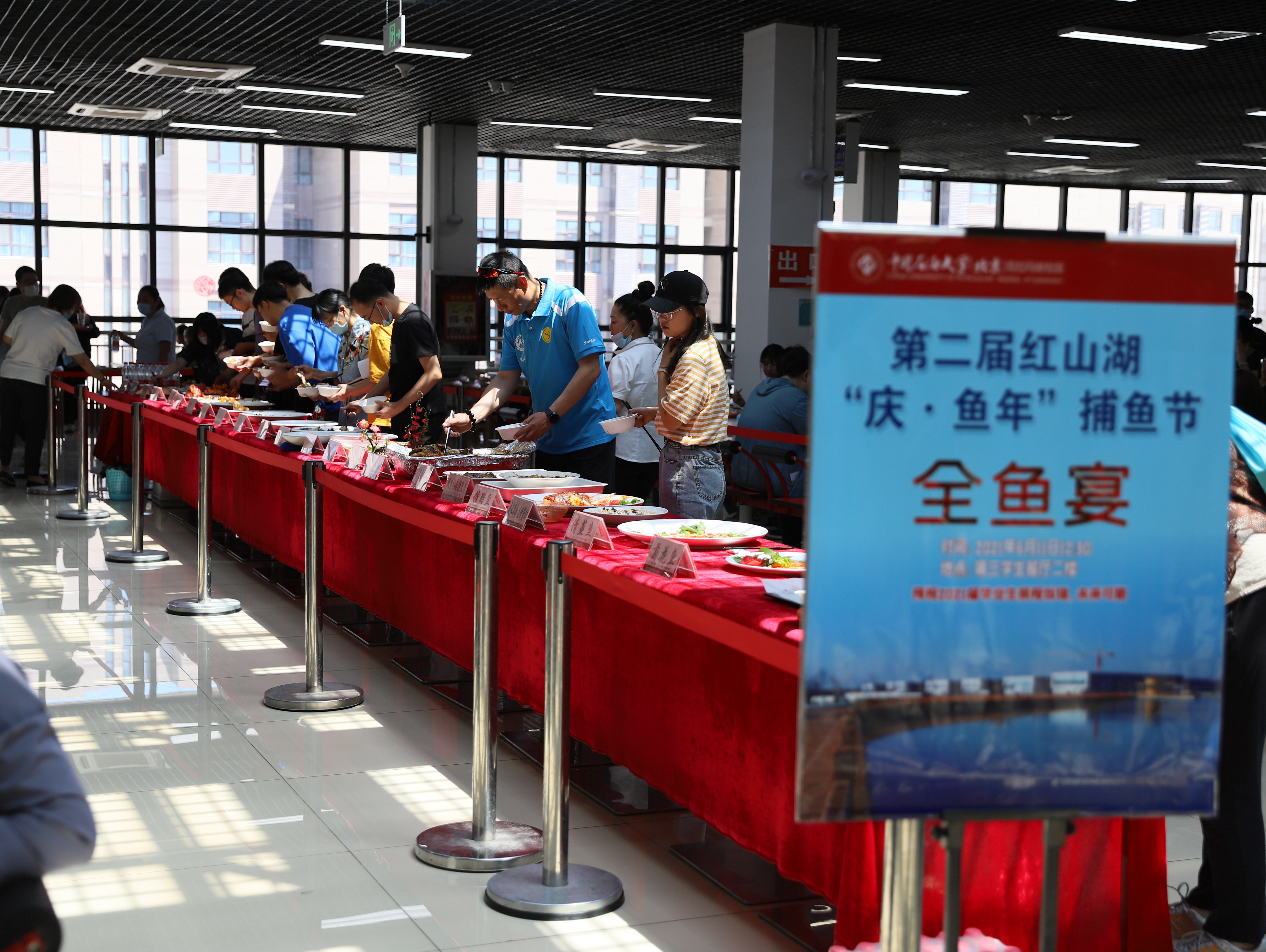 红山湖畔热闹非凡,餐厅后厨也忙得热火朝天。师傅们大显身手,将第一时间送抵的鲜鱼精心烹饪成十余种各式菜肴,为校区师生制作了一桌丰盛的“全鱼宴”,并邀请克拉玛依市其他高校领导和现场部分就餐师生共同前来“尝鲜”。经历了丰收的喜悦,又得以品尝劳动的成果,师生们的心里都美滋滋的。校区校园管理部工作人员介绍,“早在5月初,校区便开始着手准备本次捕鱼节活动的相关事宜,将红山湖水和鱼的样本提前送检,确保饮食安全健康。除全鱼宴外,活动当天,校区食堂也推出了麻辣鱼、剁椒鱼、清蒸鱼和红烧鱼四款套餐,毕业生可凭餐券免费享用,希望同学们能够不论走得多远、飞得多高,都不要忘了母校的味道。”