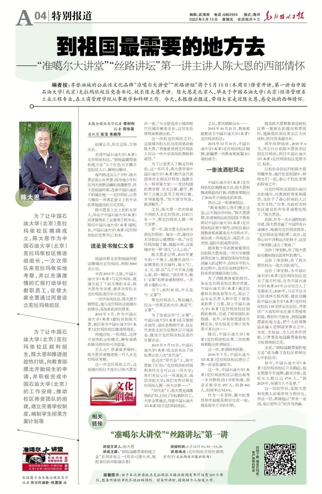 两年挂职结束,2018年6月,风尘仆仆刚回到北京的陈大恩,再次回到克拉玛依,担任克拉玛依校区党委书记、校长。
