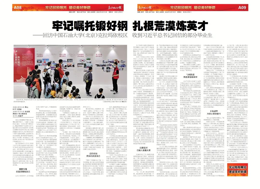 2020年9月,中国石油大学(北京)克拉玛依校区举办学习贯彻习近平总书记回信精神主题展。两年来,该校区学生牢记习近平总书记的殷殷嘱托,扎根边疆,努力成为可堪大用、能担重任的西部建设者。(本报资料图,本报全媒体记者蒋剑 摄)