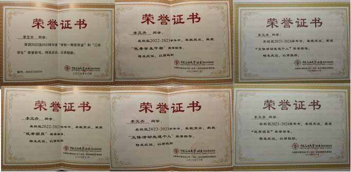 进入中石大后,李艾齐也一如既往的严格要求自己。她保持专业排名前5%,担任经济学22-1班团支书。曾获得联合能源奖学金、校三好学生、优秀学生干部、优秀团员、文体先进个人、科技创新先进个人等荣誉称号。学科竞赛上,大二至大三期间,各类学科竞赛累计获得四项国家级奖项、三项省级奖项;学术方面也积极探索,发表专业相关学术论文2篇,录用国家级期刊和国际会议论文各1篇(以上均为第一作者),参与三篇sci论文写作,授权国家新型实用性专利一项。