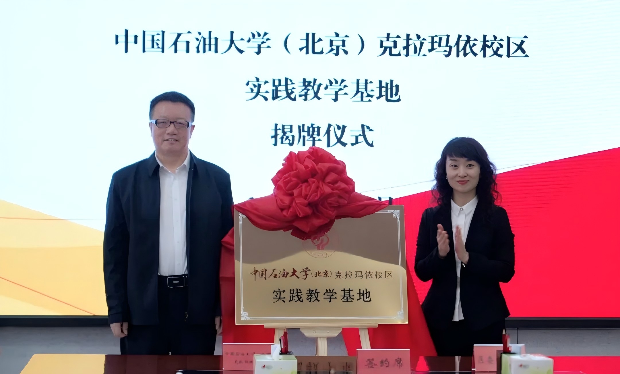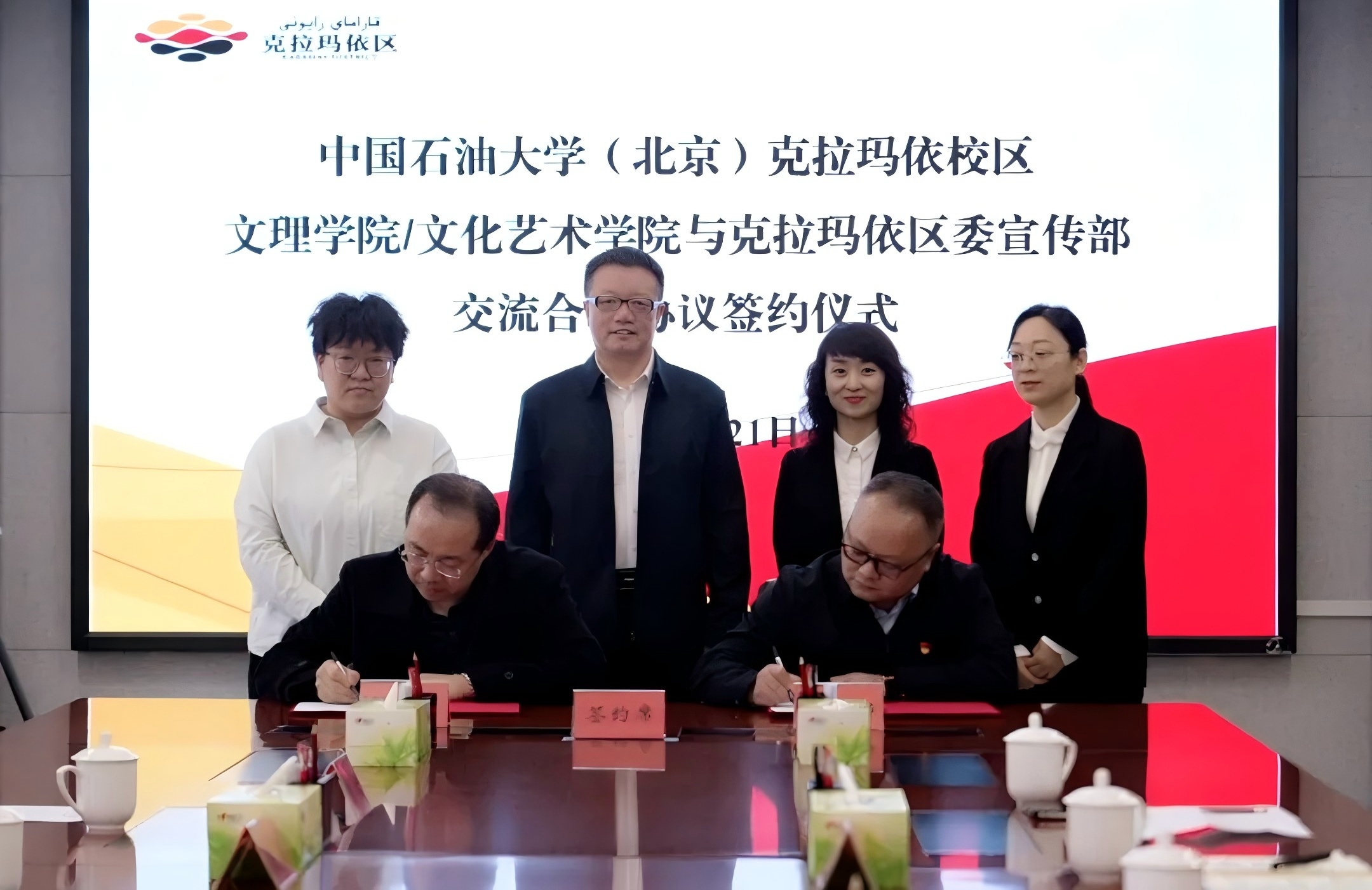 为贯彻市委、区委校城融合相关会议精神,3月21日,中国石油大学(北京)克拉玛依校区文理学院/文化艺术学院与克拉玛依区委宣传部交流合作协议签约仪式在区机关主三楼会议室举行。双方签署《宣传思想文化领域交流合作协议》,揭牌“中国石油大学(北京)克拉玛依校区实践教学基地、复合型人才培养基地”。