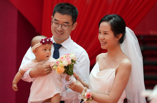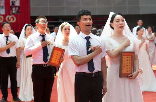 6月28日,身着笔挺西装和洁白婚纱的55对伉俪,庄重地将右手放在心口,一字一句地许下诺言。