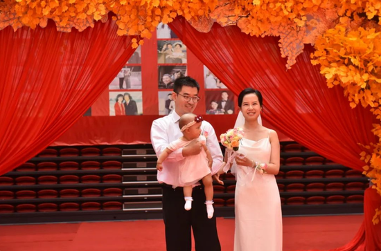 新人们依次入场站定,主持人一一介绍,每介绍完一个,掌声就会在全场响起。新人们在花树下站定挥手,摆出一个个有爱的姿势,有些新人也把自己的宝贝带到现场,让长在天山脚下的孩子共同见证爸爸妈妈的爱情。