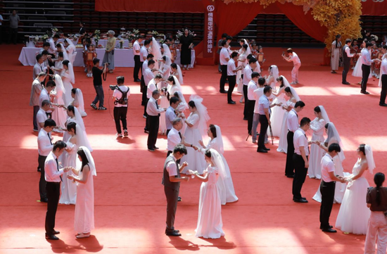 仪式尾声,全体新人在欢快的乐曲中领唱各年龄段的爱情歌曲。从《月亮代表我的心》到《小幸运》,从《爱如潮水》到《最美的期待》,不同年代的经典歌曲在红山湖体育馆内回荡,诉说着共同的甜蜜。新人们还向看台抛洒喜糖,现场热闹非常。