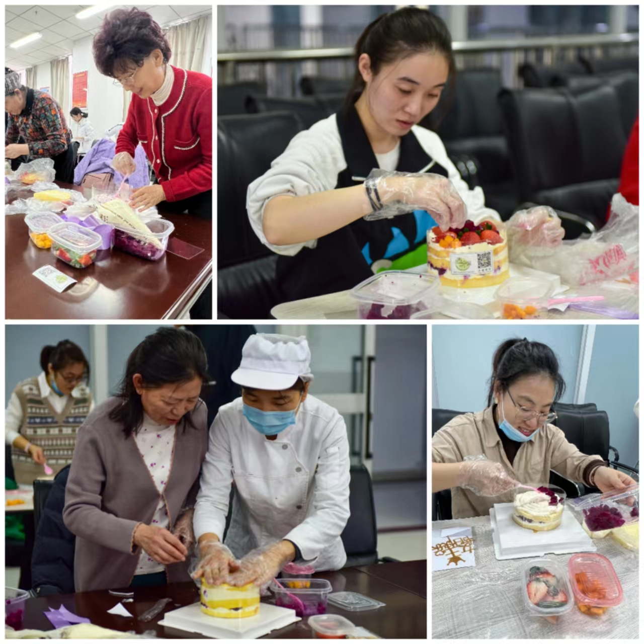 涂抹奶油,摆放水果夹心、裱花装饰……老师们在蛋糕师傅的一步步示范指导下,很快掌握了蛋糕制作的步骤和诀窍,手握工具涂抹雕琢,细心耐心的完成每一个环节。一个个金黄甜香的蛋糕胚裹上香浓顺滑的奶油,再配以酸甜可口的水果,在大家的创作和探索中变成了一个又一个精美的小蛋糕。每一位老师都兴奋的展示着自己的劳动成果,现场不时传来阵阵欢声笑语,每一帧画面都充满温馨与幸福。