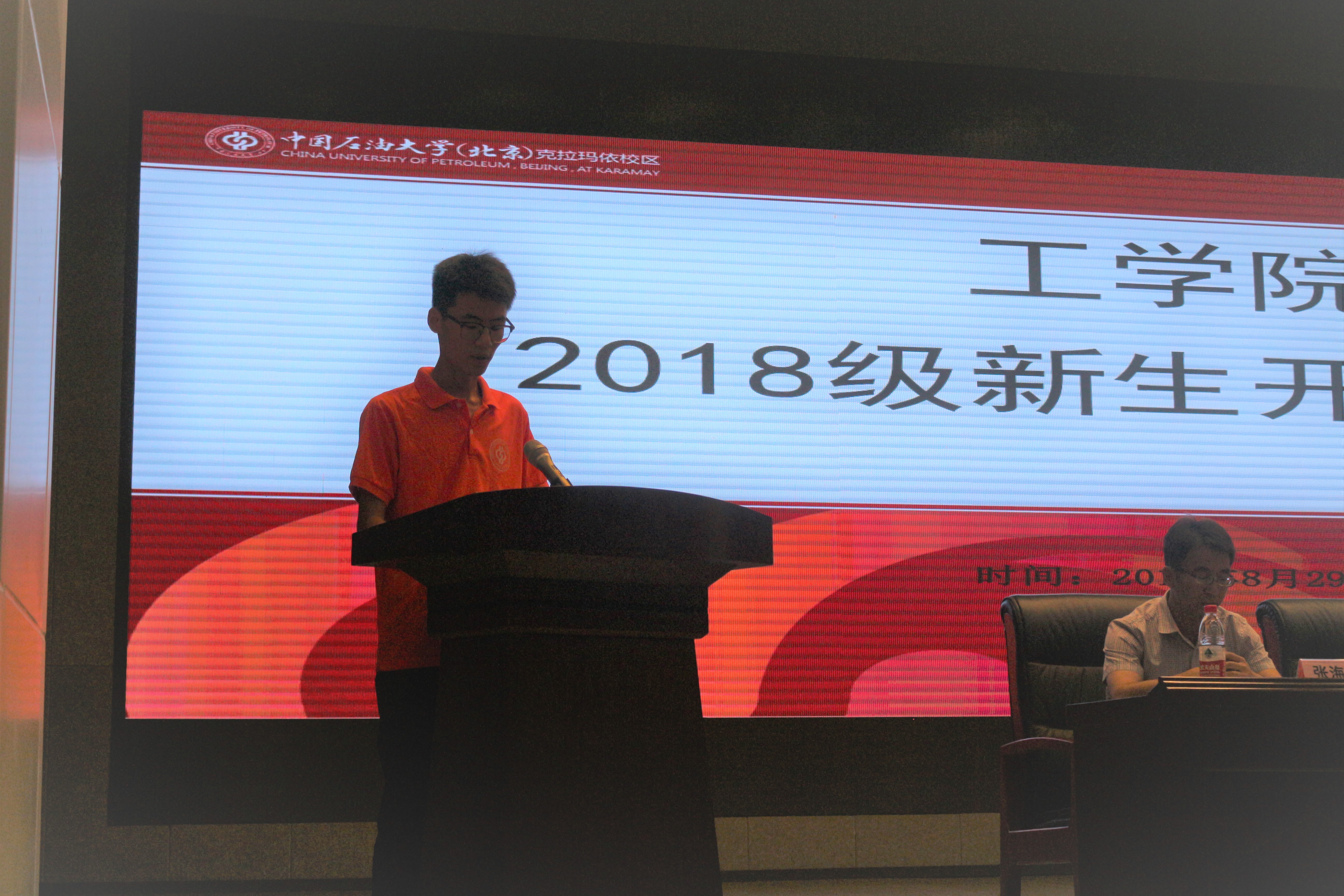 高年级学生代表过控系王晓鹏发言,对从全国各地远道而来的新生表示热烈的欢迎,并祝贺各位新同学开启了自己人生的新征程,希望新生和老生能够携手,将中国石油大学(北京)“求实创新,艰苦奋斗”的精神传承下去。