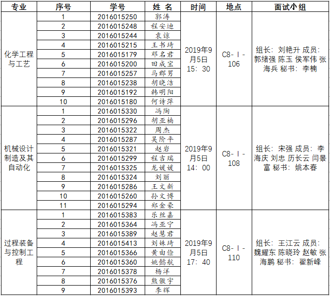 | 机械设计制造及其自动化 | 1 | 2016015330 | 冯陶 | 2019年9月5日14:00 | C8-Ⅰ-108 | 组长:宋强 成员:李海庆 刘忠 历长云 闫景富 秘书:姚本春 |