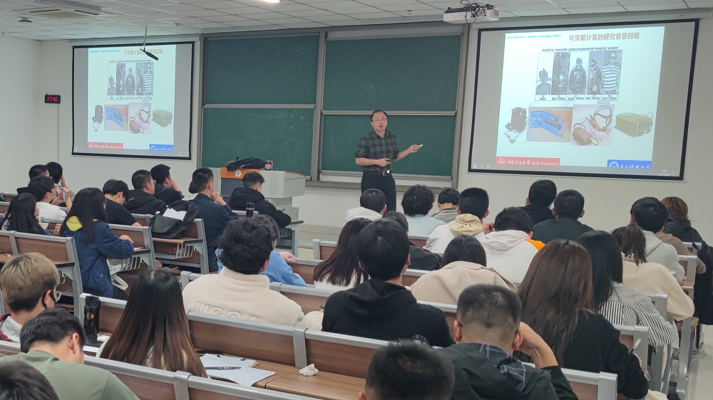 黄志奇副教授结合自己的研究方向主要阐述了可穿戴计算的研究背景以及相关技术在工业、军事、宇航、医疗、物流、娱乐等领域的应用,他认为可穿戴计算是增强人的能力和以辅助人为主要目的的一种崭新和独特的计算模式,黄志奇副教授围绕包括专用交互设备、核心计算模块、软件和人机交互在内的可穿戴计算机的核心技术,介绍了身体传感网络及其发展趋势,他提出了“我们是设计我们的生活,不仅是设计设备,设计是以人为中心,不是以设备为中心”的思想,引发了师生们对穿戴的该不该是设备的问题的思考,同时黄老师下了一个简洁的判断:“智能织物、蓝领计算和情感计算应该是下一个十年可穿戴计算领域的主题。”