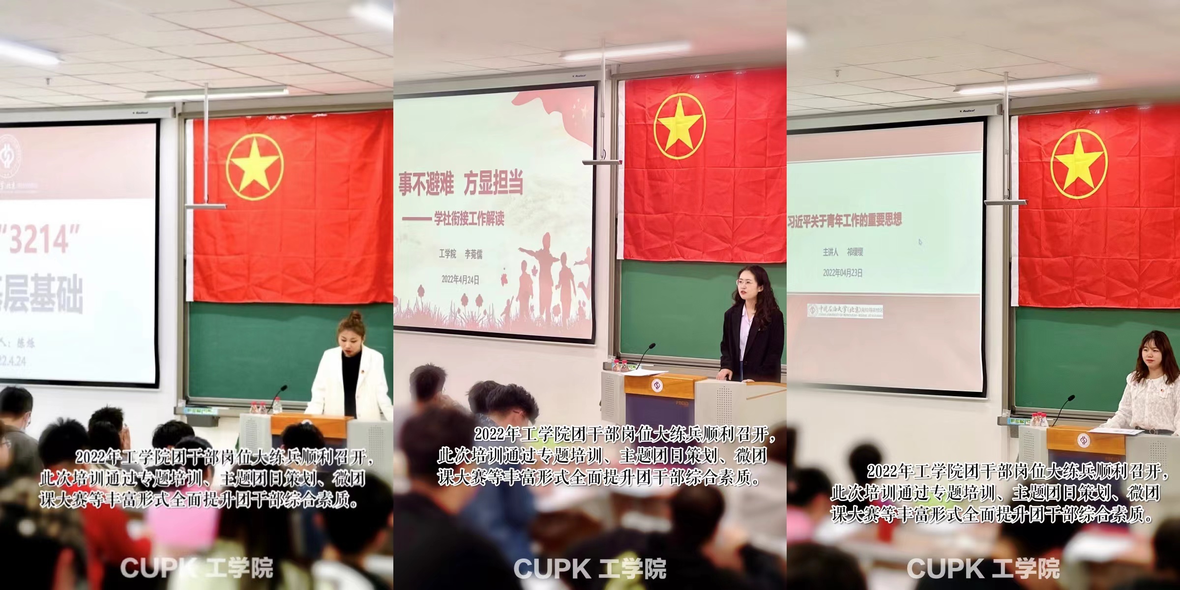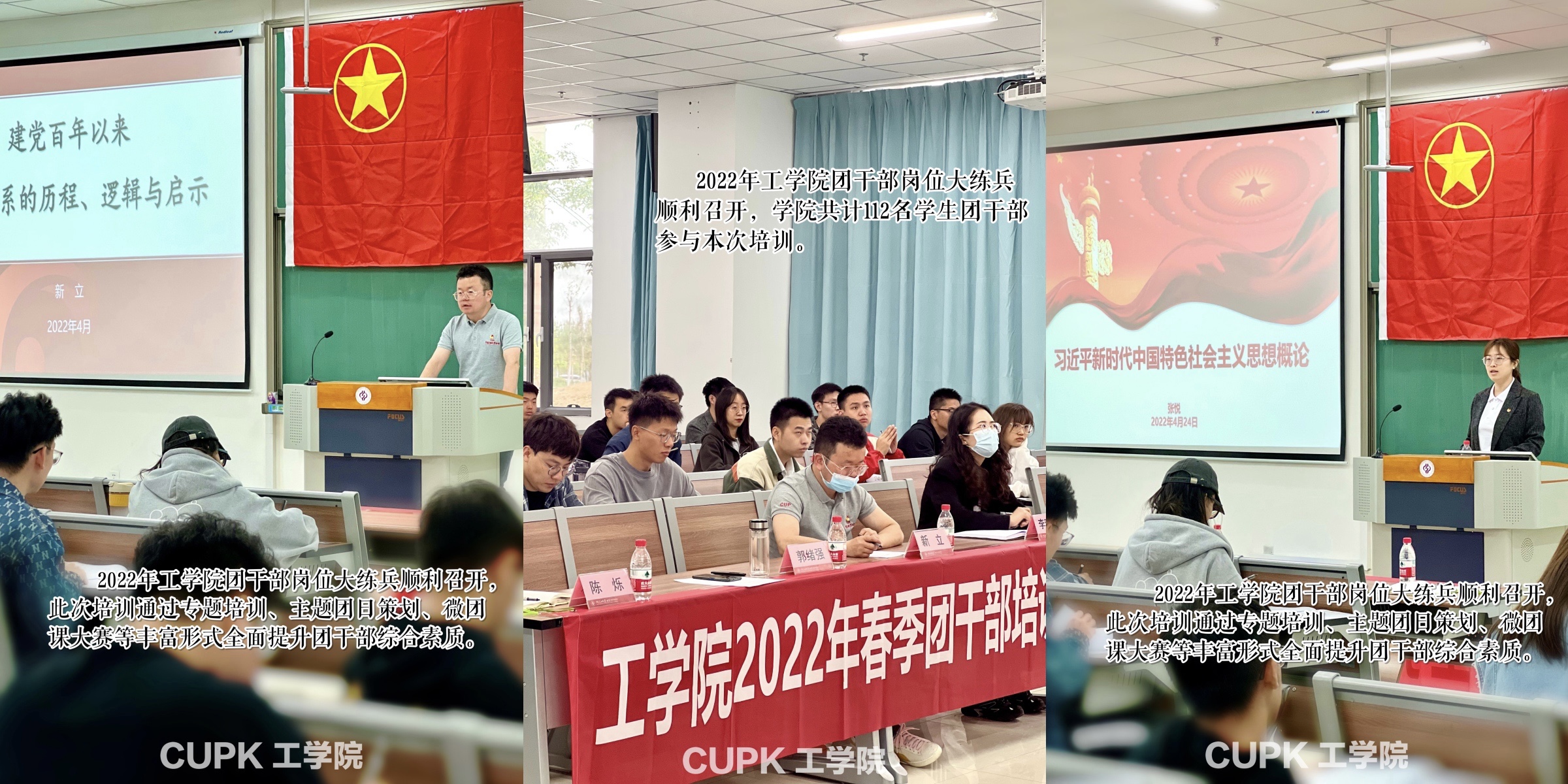 此外,工学院全体辅导员分专题讲授团课,教学内容包括《习近平新时代中国特色社会主义思想概论》、《建党百年来党团关系的历程、逻辑与启示》、《习近平总书记关于青年工作的重要思想解读》、《“3214”基础团务解读》与《学社衔接工作解读》。通过主题团课引导团干部坚定理想信念、提高工作能力、锤炼优良作风。