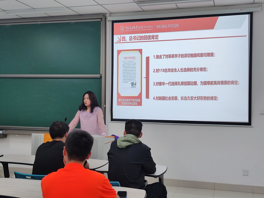 学院团总支书记新立老师带领学生参观回信展,结合主题班会深入学习党的二十大精神,鼓励同学们争做踔厉奋发,扎根奉献的中石大人。