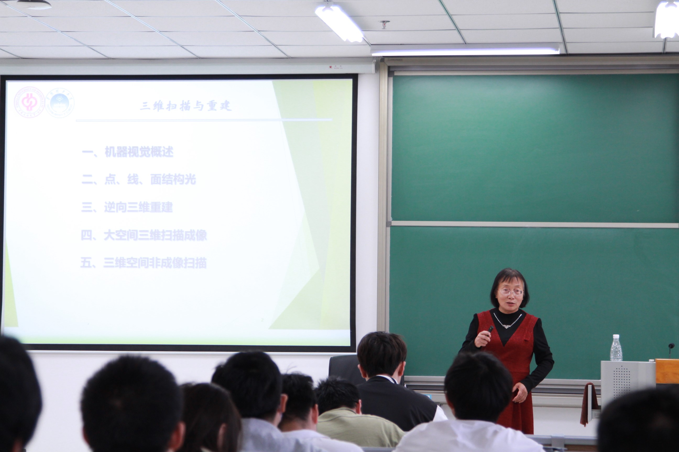 全燕鸣教授声情并茂地为师生们讲授了机器视觉、点线面结构光、逆向三维重建、大空间三维扫描成像,及三维空间非成像扫描技术。全老师首先运用实例介绍了机器视觉在生活、工业中的应用,让同学们更“近”地感受到机器视觉,接着介绍了点、线、面结构光的原理,然后邀请同学上台互动,演示了如何进行人身体模型的三维扫描和逆向重构,最后介绍了空间大范围三维扫描成像技术和三维空间非成像扫描技术的应用和发展。全老师毫无保留地向校区师生介绍了自己多年来带硕、博研究生在机器视觉方面取得的研究成果。这极大地开阔了师生们的眼界。