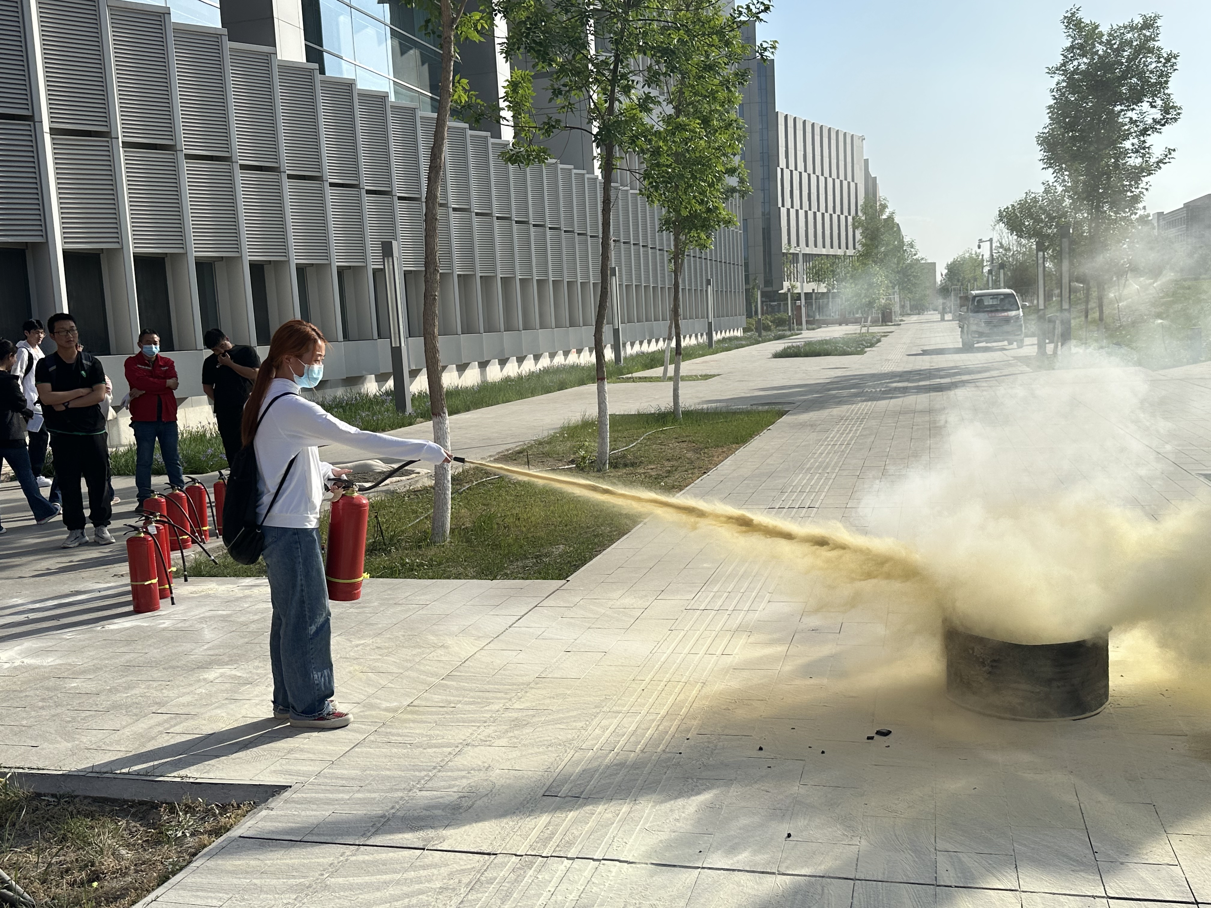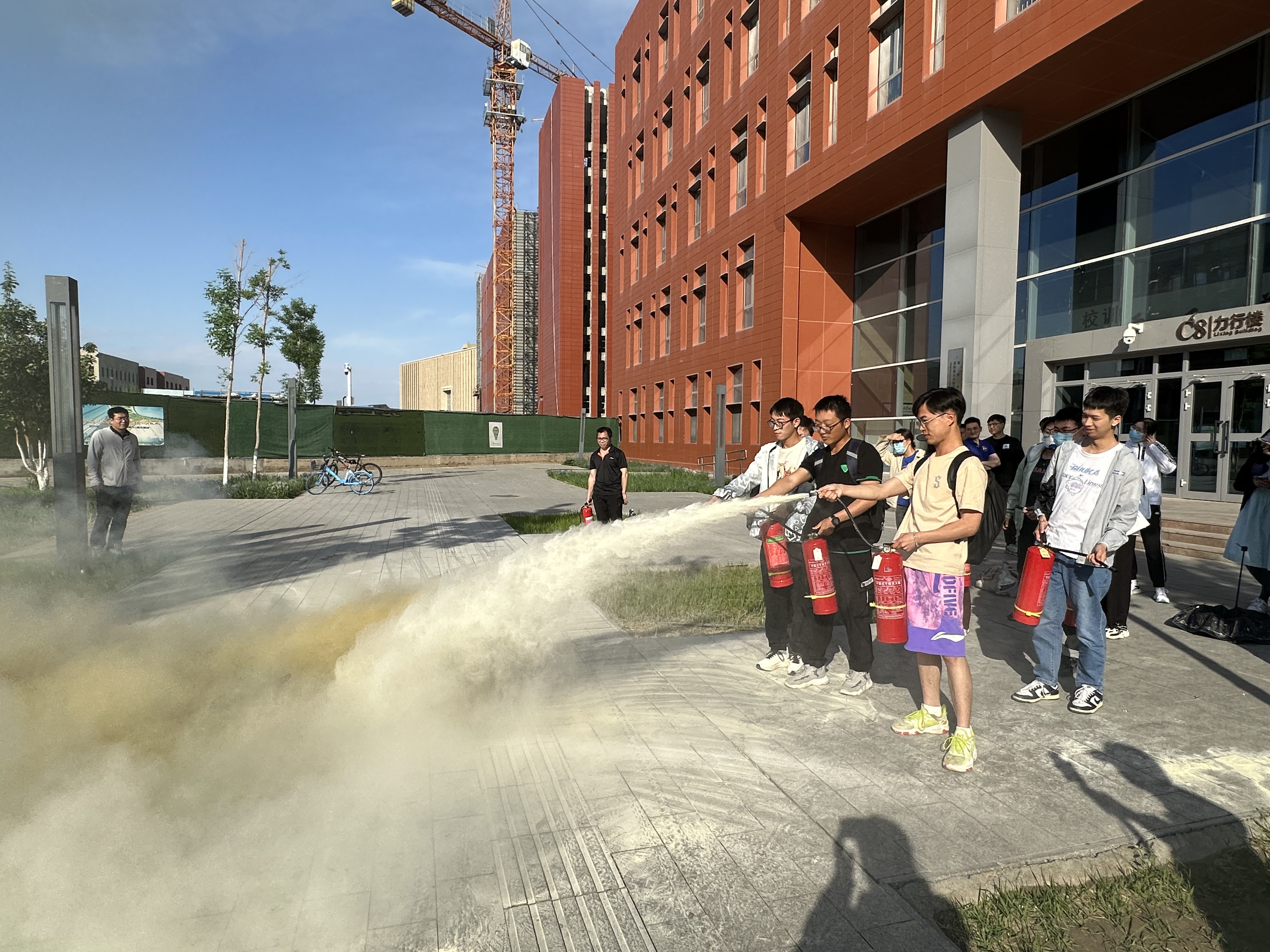培训结束后,参会人员在C8楼北门前空地进行灭火实操演练。宣讲员介绍了灭火器具体操作使用方法,同学们积极参加实地演练火灾扑救。