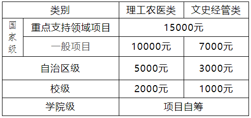 学院可分别申报国家级项目不超过5项(重点支持领域项目不超过1项)、自治区级项目不超过8项、校级项目不超过15项,学院级不限;项目名额分配方案根据实际申报情况可酌情调整。各类项目资助金额标准见下表,项目经费仅用作项目组学生开展研究使用,鼓励各学院自筹资金配套支持。