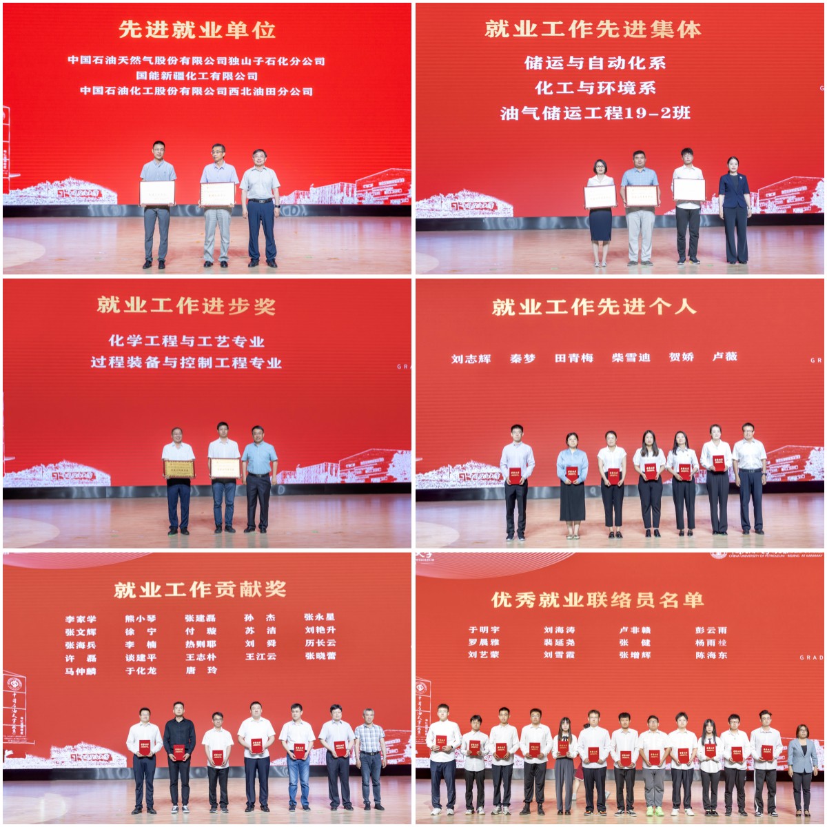 大会首先对为学院2023届就业工作做出突出贡献的集体和个人进行表彰。胡庆喜为中国石油独山子石化分公司、中国石化西北油田分公司、中国神华国能新疆化工有限公司等3家先进就业单位颁发奖牌;张红艳为储运与自动化系、环境与化工系、储运19-2班等3个就业先进集体颁发奖牌;徐长亮、邢晓凯、邢廷炎、历长云、吴梅等分别为“就业工作进步集体”“就业工作先进个人”“就业工作贡献奖”“基层就业奖”“优秀就业联络员”等集体和个人颁奖。