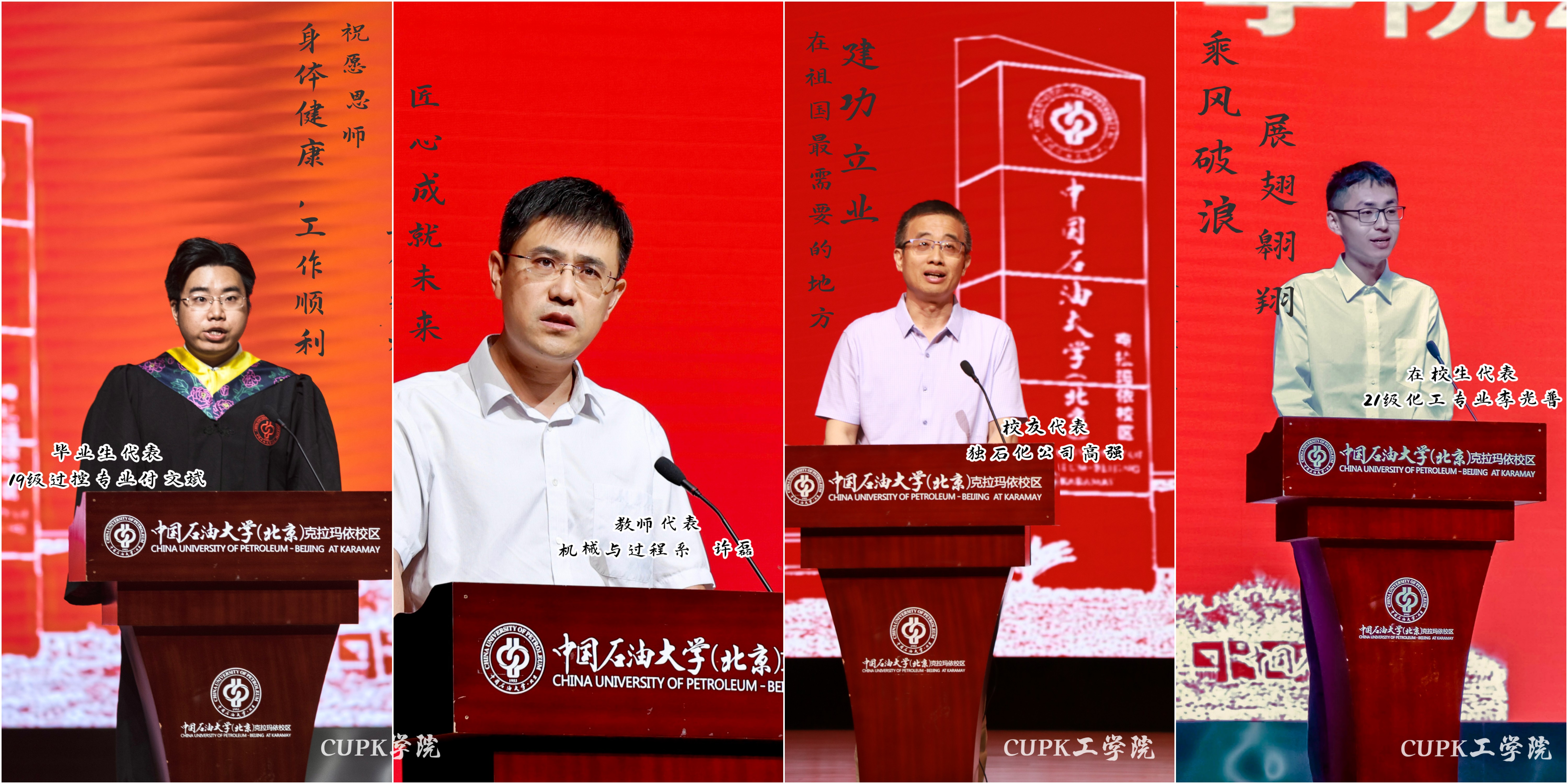 教师代表、机械与过程系许磊教授,毕业生代表、2019级过程装备与控制工程专业付文斌,在校生代表、2021级化学工程与工艺专业李光普,校友代表、中国石油克拉玛依石化公司班组运行工程师李帅,企业代表、中国石油独山子石化分公司委组织部副部长高强在毕业典礼上先后发言,共同表达对毕业生的美好祝福和对学校的真诚感谢。